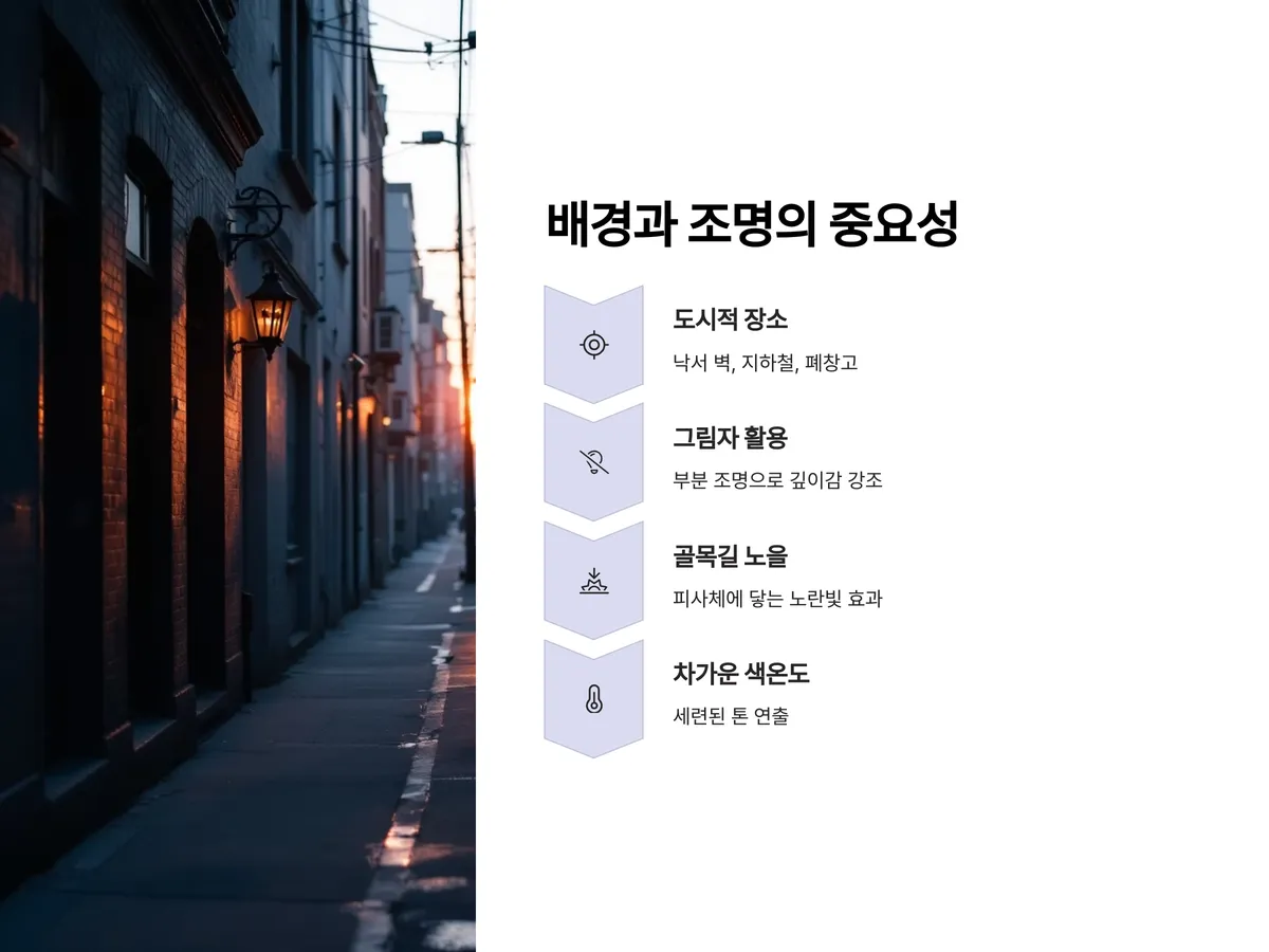 노을이 지는 골목길에서 노란빛이 피사체의 뺨에 닿는 장면, 백라이트로 인해 생기는 실루엣 효과 등은 인스타그램 피드에서 강한 시선을 끌 수 있습니다. 또한 조명의 색온도를 낮춰 차가운 느낌을 강조하면, 전체적인 톤이 세련되게 정돈됩니다.