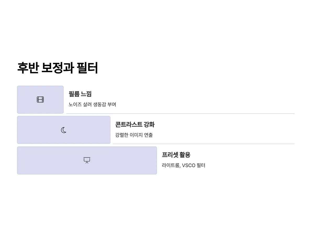 특히 어도비 라이트룸이나 VSCO의 프리셋 활용은 쉽고 빠르게 분위기를 통일시켜주며, 흑백 필터와 아날로그 스타일의 컬러톤은 트렌디함을 더합니다. 영상 촬영 시에도 동일한 LUTs 필터를 적용하면 통일감 있는 브랜드 이미지를 완성할 수 있습니다.