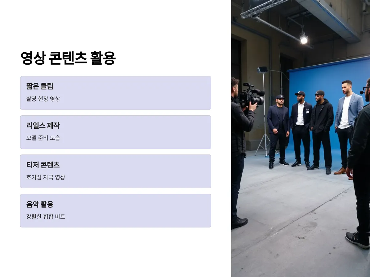 화보만으로는 부족합니다. 요즘은 짧은 영상 콘텐츠가 사용자 반응을 가장 빠르게 이끌어내는 수단입니다. 촬영 현장을 짧게 클립으로 구성하거나, 촬영 전후 모델의 준비 모습 등을 리일스로 제작해 업로드하면 브랜드의 인간적인 면모도 함께 전달할 수 있습니다. 또한 이러한 콘텐츠는 화보보다 훨씬 더 적은 비용으로 제작이 가능하면서도 도달률과 전환률이 높습니다.