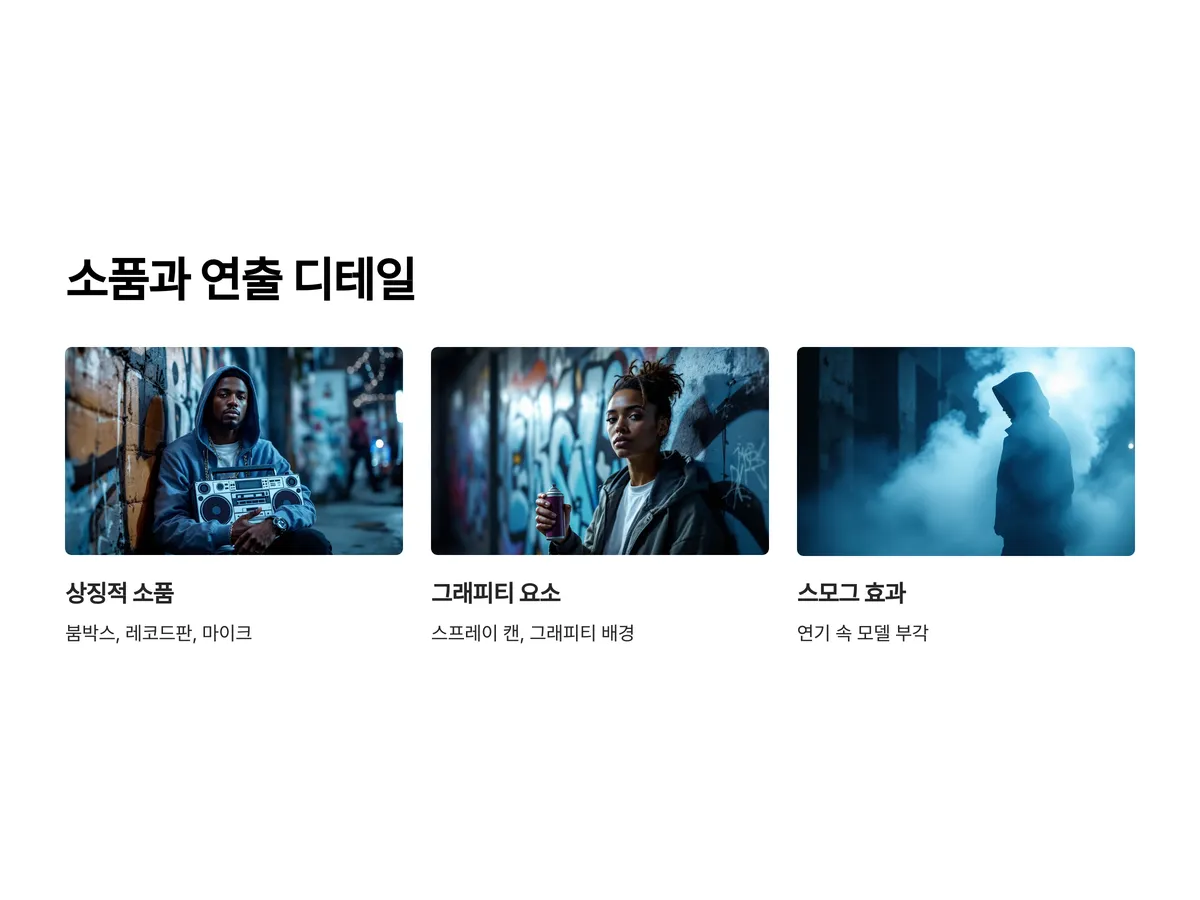 소품은 단순한 배경을 넘어 브랜드 스토리와 연결되어야 합니다. 대표적인 소품은 붐박스, 레코드판, 마이크, 오버이어 헤드폰, 스케이트보드 등이 있습니다. 여기에 그래피티 배경과 함께 배치하면 더욱 힙합스러운 감각을 연출할 수 있습니다. 또한 스모그 머신을 이용한 연출은 연기 속에서 모델을 부각시켜 더욱 강렬한 이미지를 제공합니다.