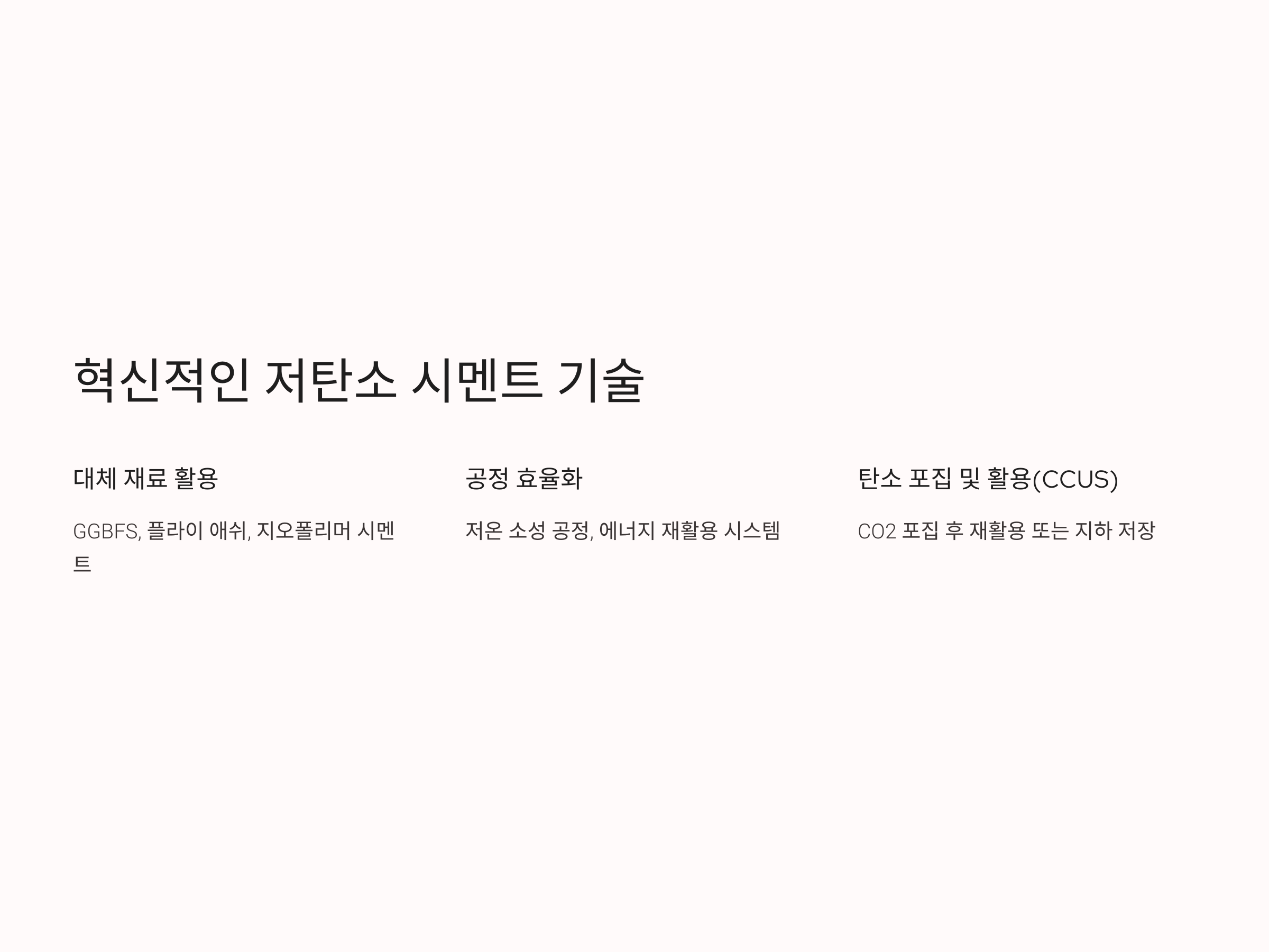 저탄소 시멘트 기술은 다양한 접근 방식을 통해 구현되고 있습니다. 주요 기술로는 대체 재료 활용, 공정 효율화, 그리고 탄소 포집 및 저장 기술이 있습니다.