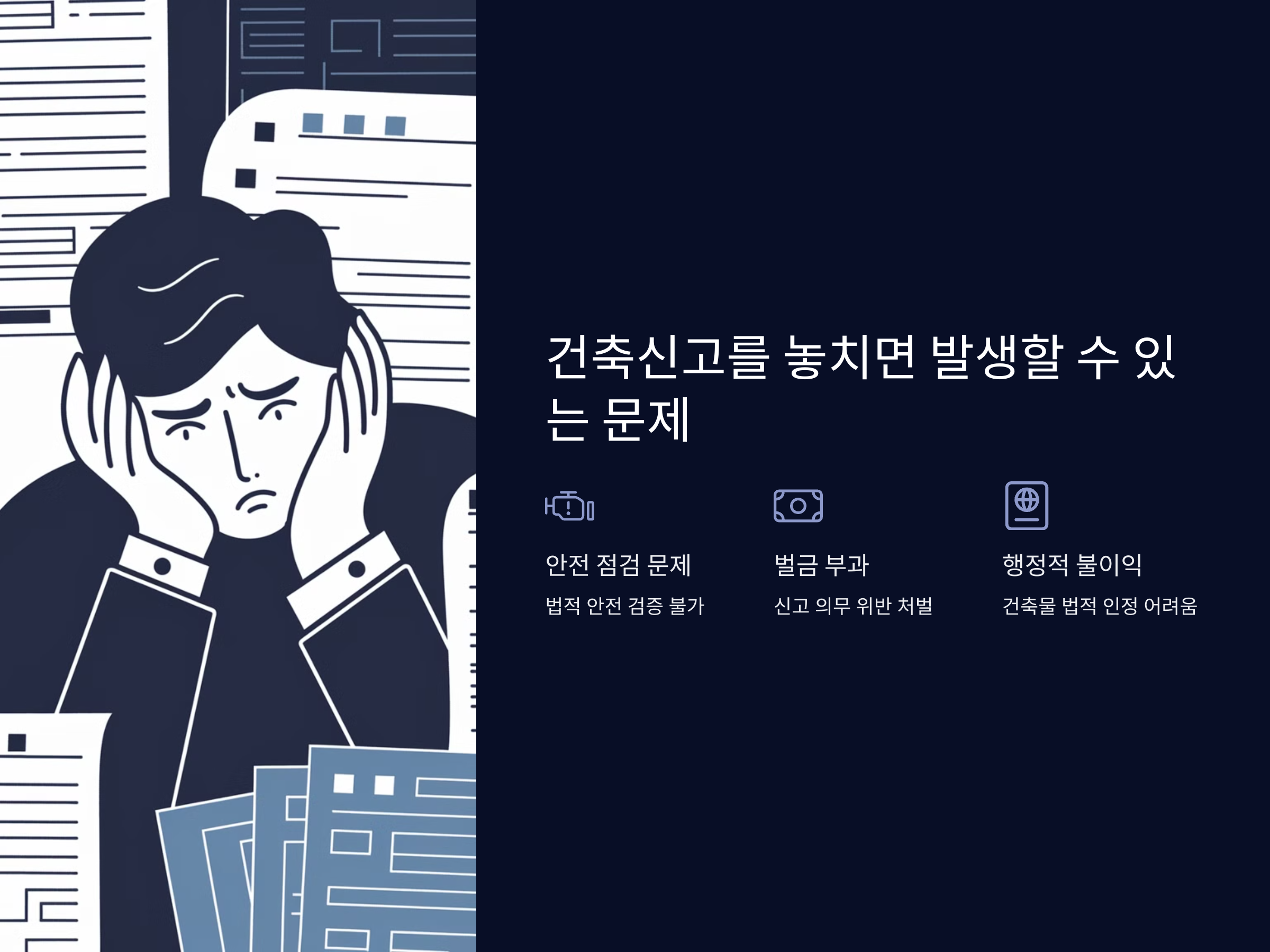 건축신고는 법적인 요구사항이지만, 건축허가에 비해 간단한 절차로 진행됩니다. 그러나 건축신고를 하지 않고 공사를 진행한다면, 추후 문제가 발생할 수 있습니다. 예를 들어, 신고가 누락된 건축물은 안전 점검을 받을 때 문제가 될 수 있으며, 일부 자치단체에서는 신고 의무를 위반한 경우 처벌을 받을 수 있습니다.