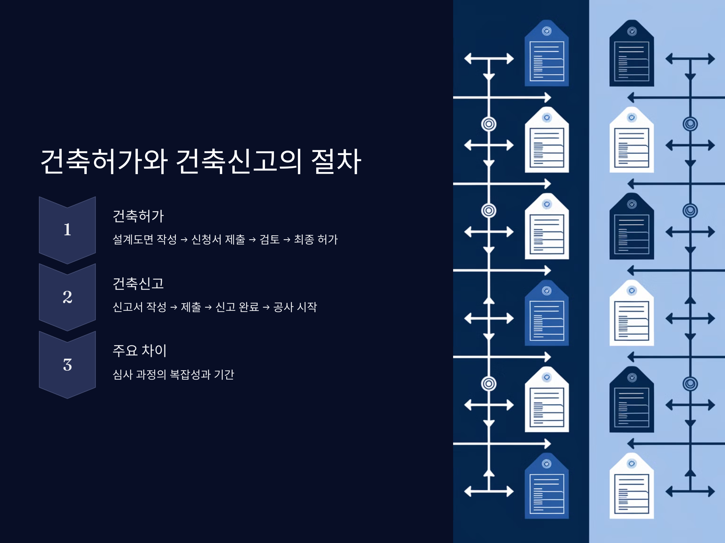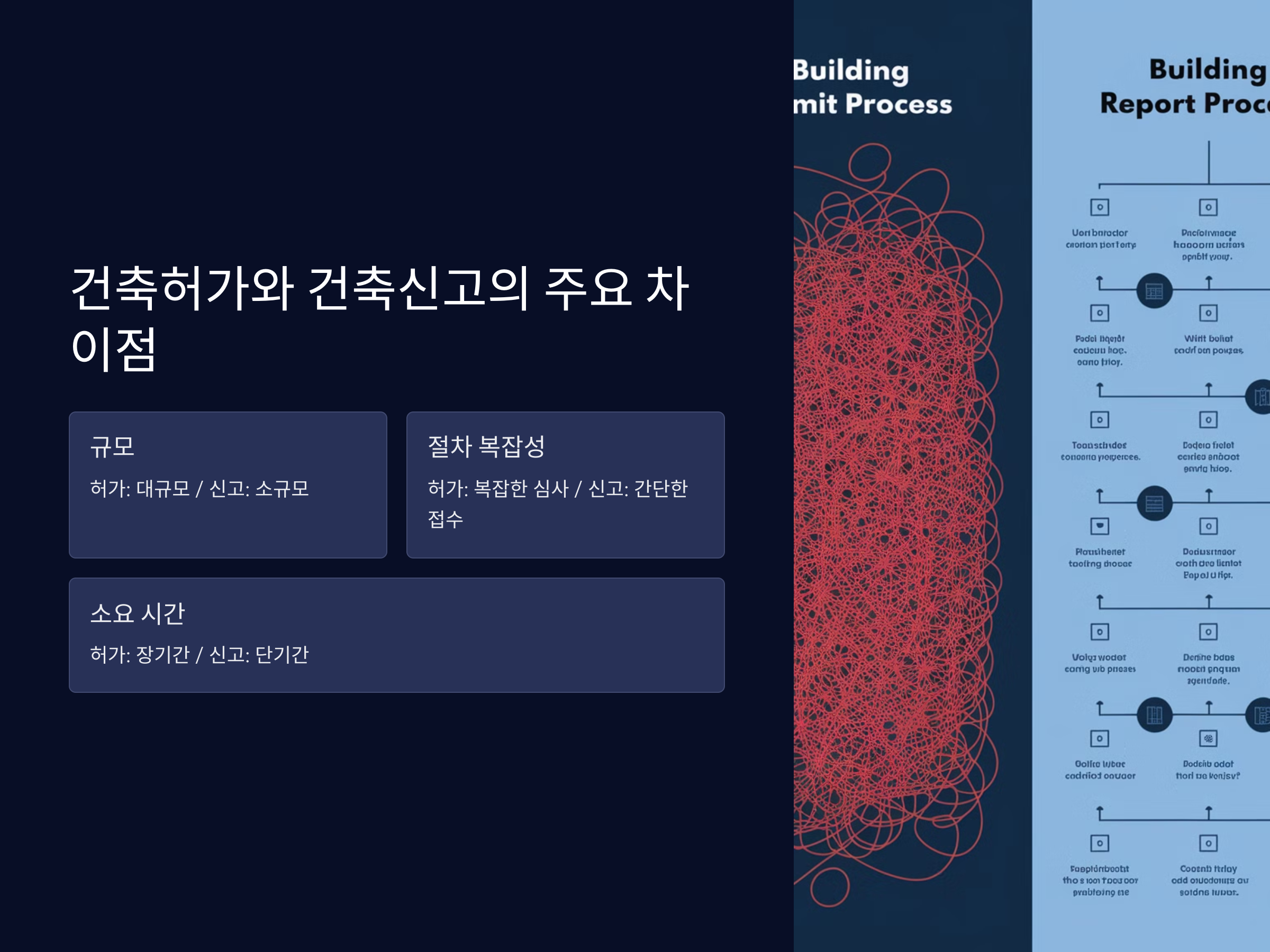 허가를 받는 것과 신고를 하는 것의 차이는 심사 과정에서 크게 다릅니다. 건축허가는 전문가들의 철저한 검토와 심사를 필요로 하고, 건축신고는 기본적인 신고 후 진행할 수 있습니다.