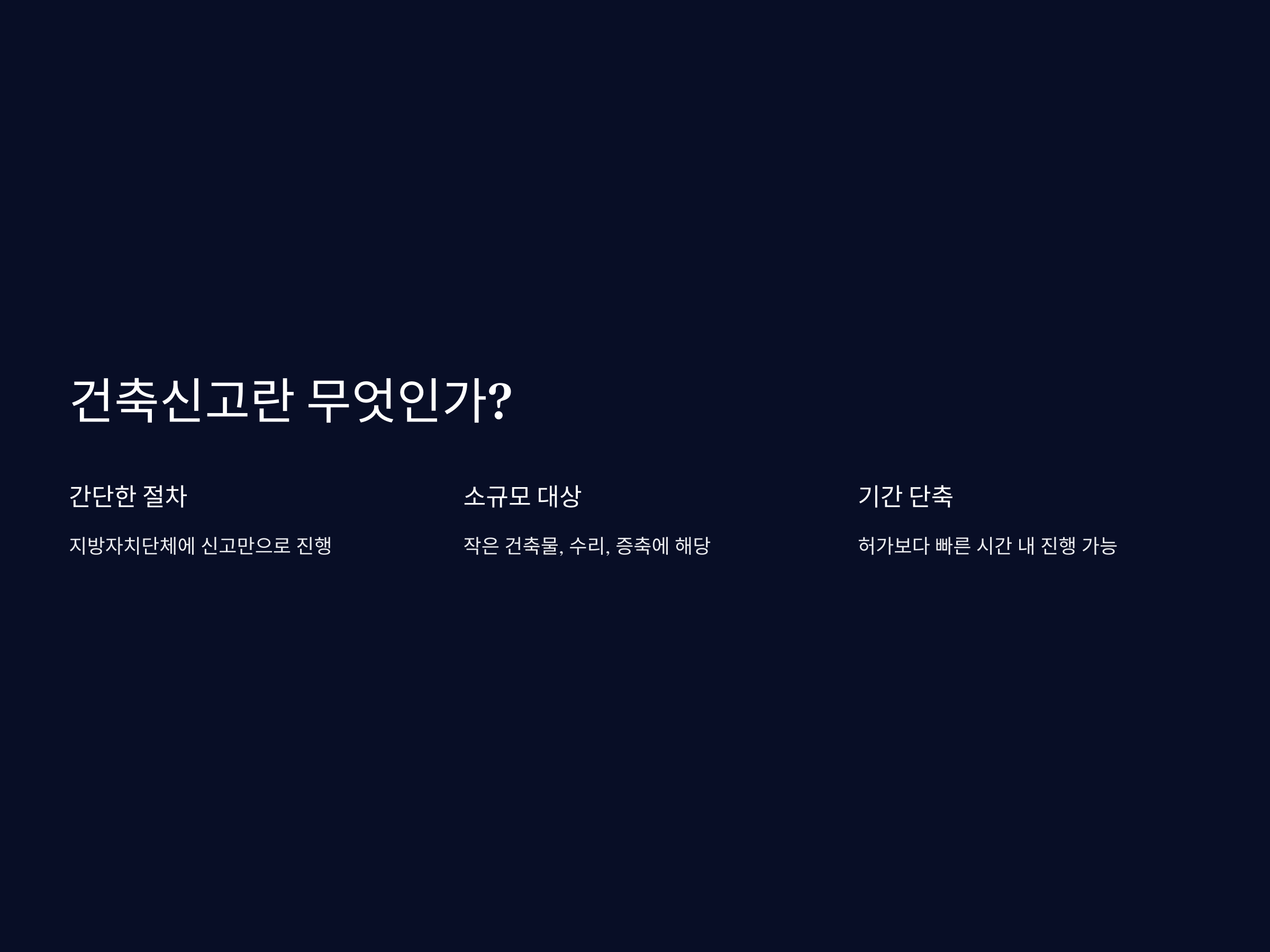 건축신고는 주로 기존 건축물의 수리나 증축, 또는 작은 규모의 건축물에 적용됩니다. 예를 들어, 단독 주택을 새로 짓거나 소규모 상가를 건설하는 경우가 이에 해당됩니다. 건축신고를 통해 공사에 대한 정보를 제공하고, 일정 기준에 맞추어 진행할 수 있도록 하는 것입니다.