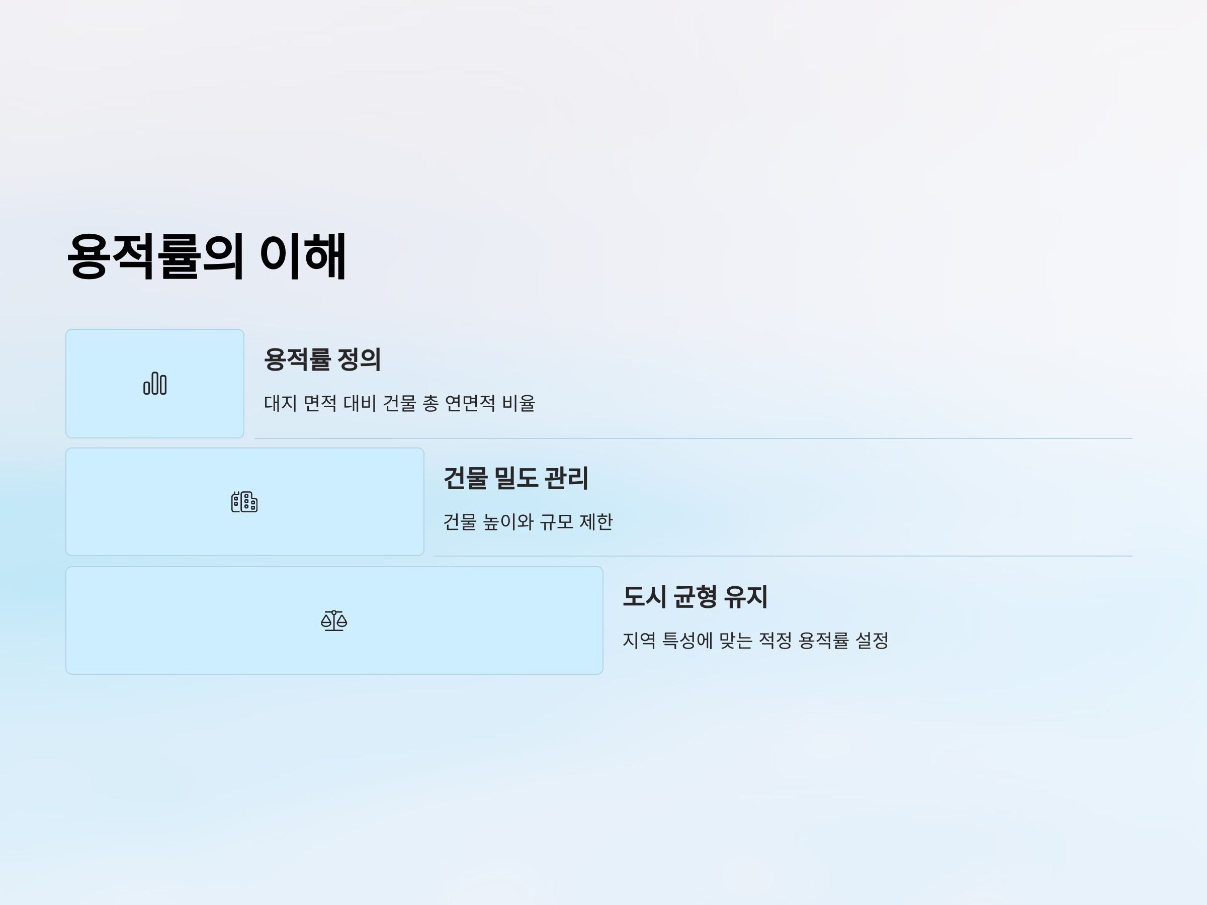 용적률은 대지 면적에 대한 건물의 총 연면적이 차지하는 비율을 의미합니다. 건축물의 총 연면적이 대지 면적에 비해 얼마나 넓은지를 나타내며, 이 비율에 따라 건물의 높이나 전체적인 규모를 제한할 수 있습니다. 용적률은 건물의 밀도를 관리하는 중요한 요소로, 너무 높은 용적률은 과밀화된 도시 환경을 초래할 수 있어 규제되고 있습니다.