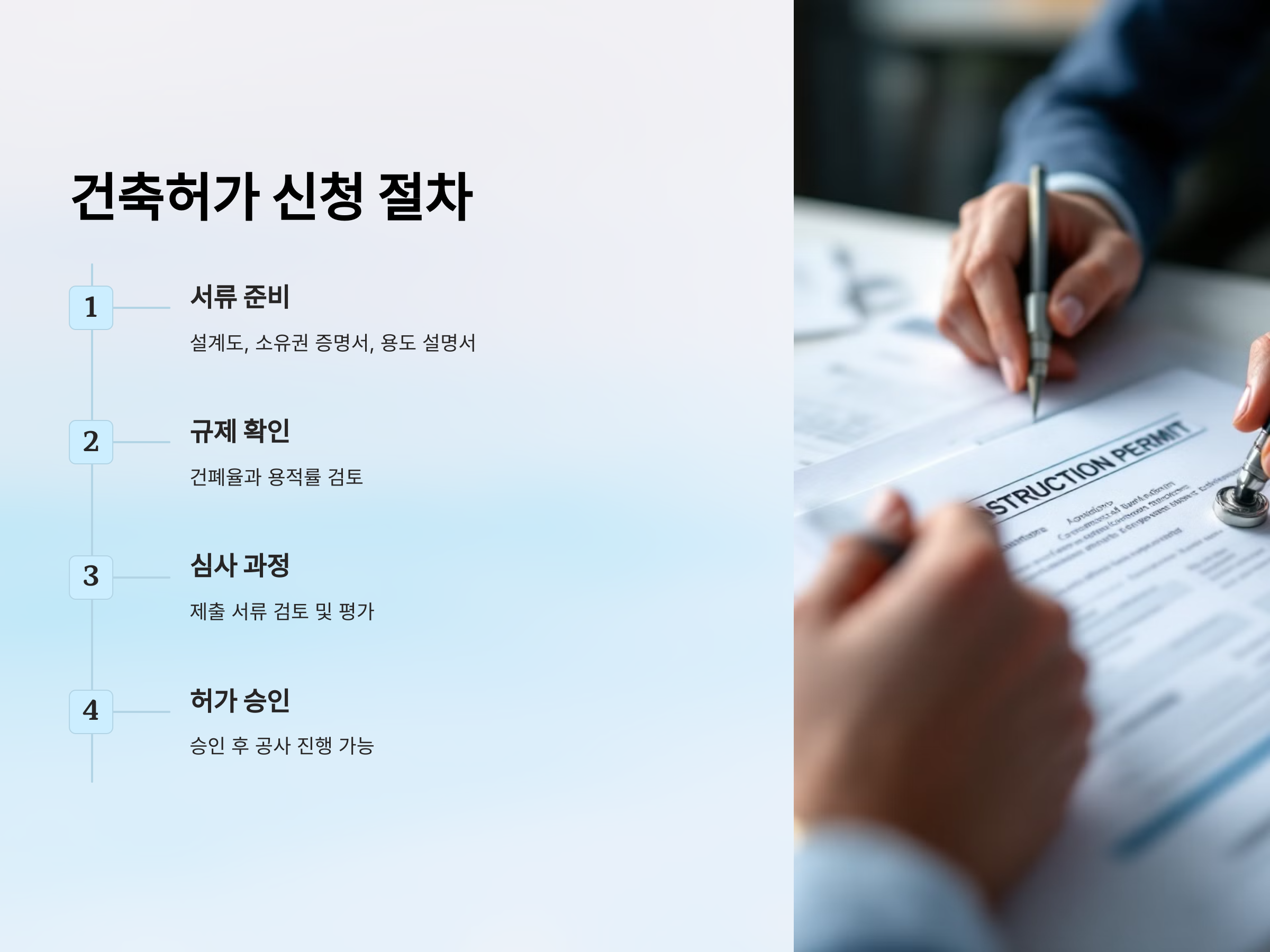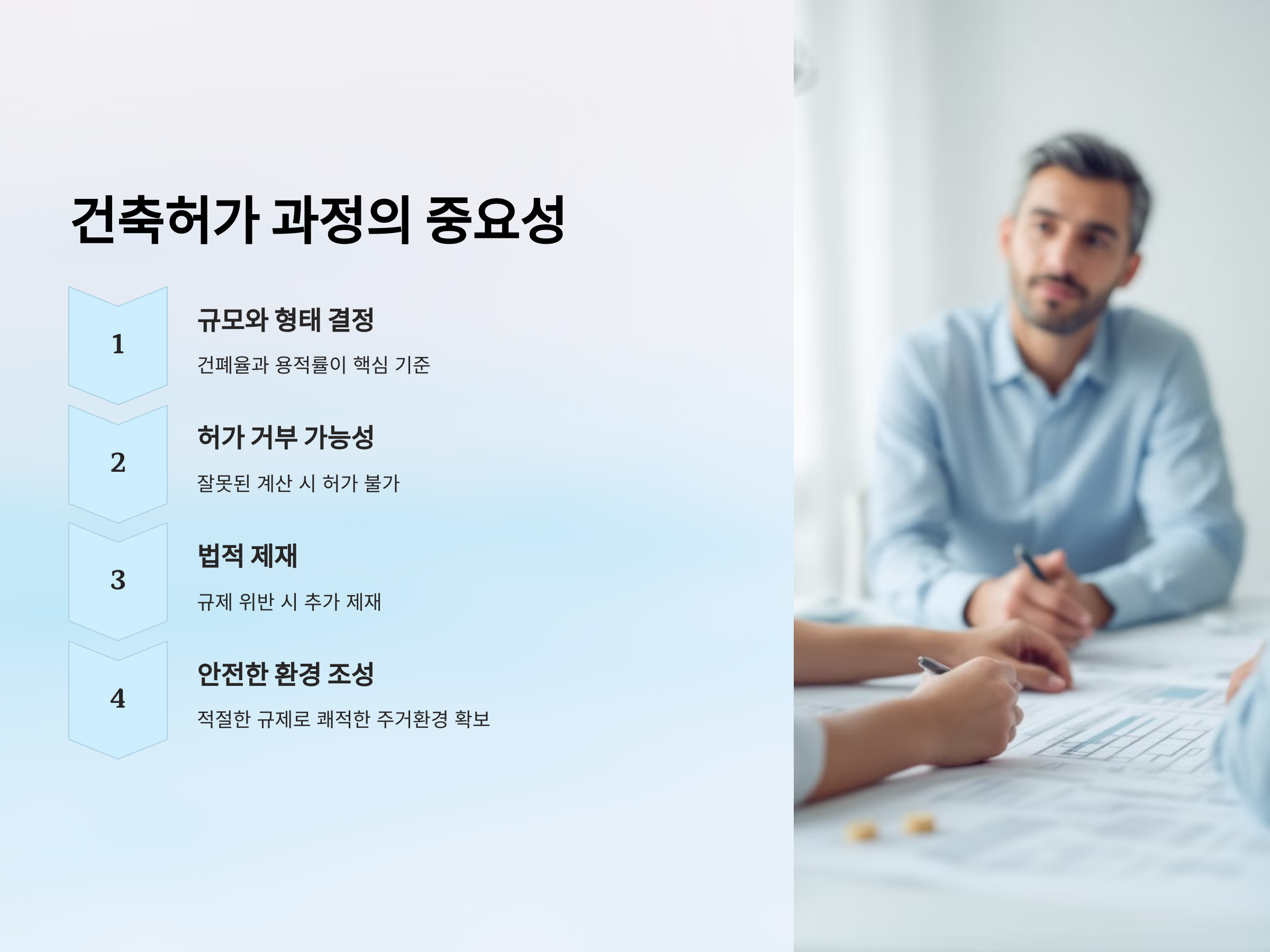 건축허가는 건축물의 설계도와 함께 제출된 서류를 검토한 후, 허가 여부가 결정됩니다. 이때, 건축허가를 신청하는 과정에서는 건폐율, 용적률뿐만 아니라, 건물의 용도, 높이, 인접한 도로와의 거리 등 여러 요소들이 고려됩니다. 따라서 건축을 계획할 때는 이러한 규제들을 충분히 이해하고 설계를 진행하는 것이 중요합니다.