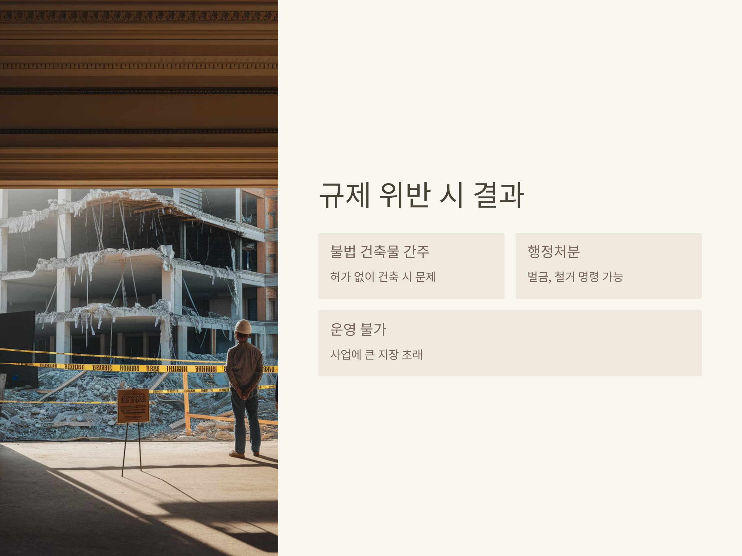 건축허가를 받지 않거나 공장 건축 기준을 위반하면, 해당 건축물은 불법 건축물로 간주될 수 있습니다. 이 경우, 벌금이나 철거 명령 등의 행정처분을 받을 수 있으며, 법적 책임을 져야 할 수도 있습니다. 또한, 불법적으로 건축된 공장은 운영이 불가능하거나, 사업에 큰 지장을 초래할 수 있습니다.