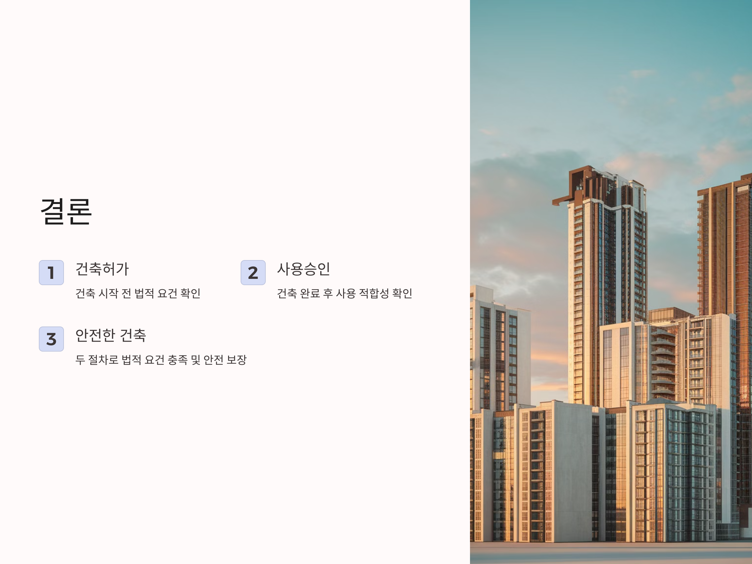 - 사용승인: 건축물이 완공된 후 실제 사용이 가능한지 여부를 확인.