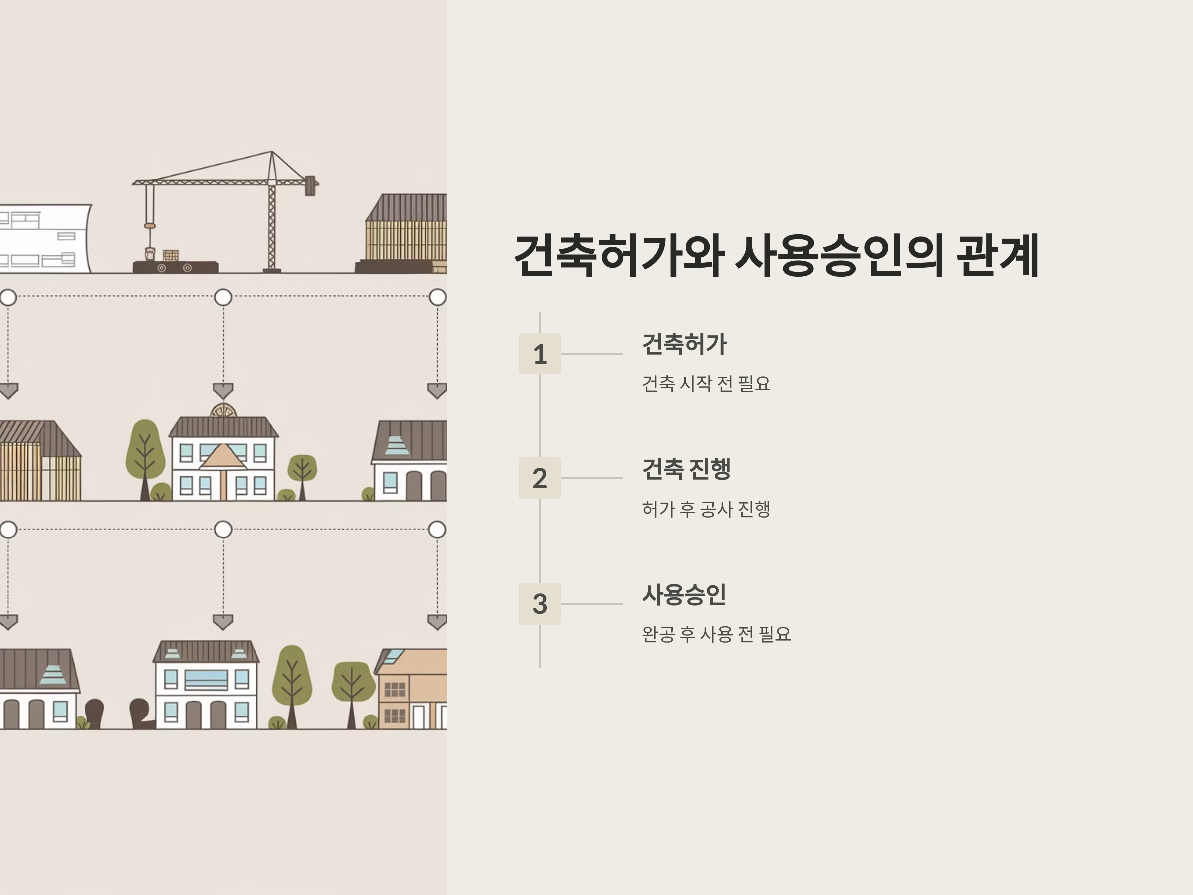 건축허가와 사용승인은 건축 과정에서 순차적으로 이루어지는 중요한 절차입니다. 건축허가가 먼저 이루어지고, 그 다음에 사용승인이 필요합니다. 건축허가는 건축을 시작할 수 있도록 허가를 내주는 절차로, 실제 건축물이 공사 중일 때 필요한 절차입니다. 반면 사용승인은 건축물이 완공된 후 사용을 시작할 수 있는 상태인지 확인하는 절차로, 건축물이 완성되고 나서야 진행됩니다.