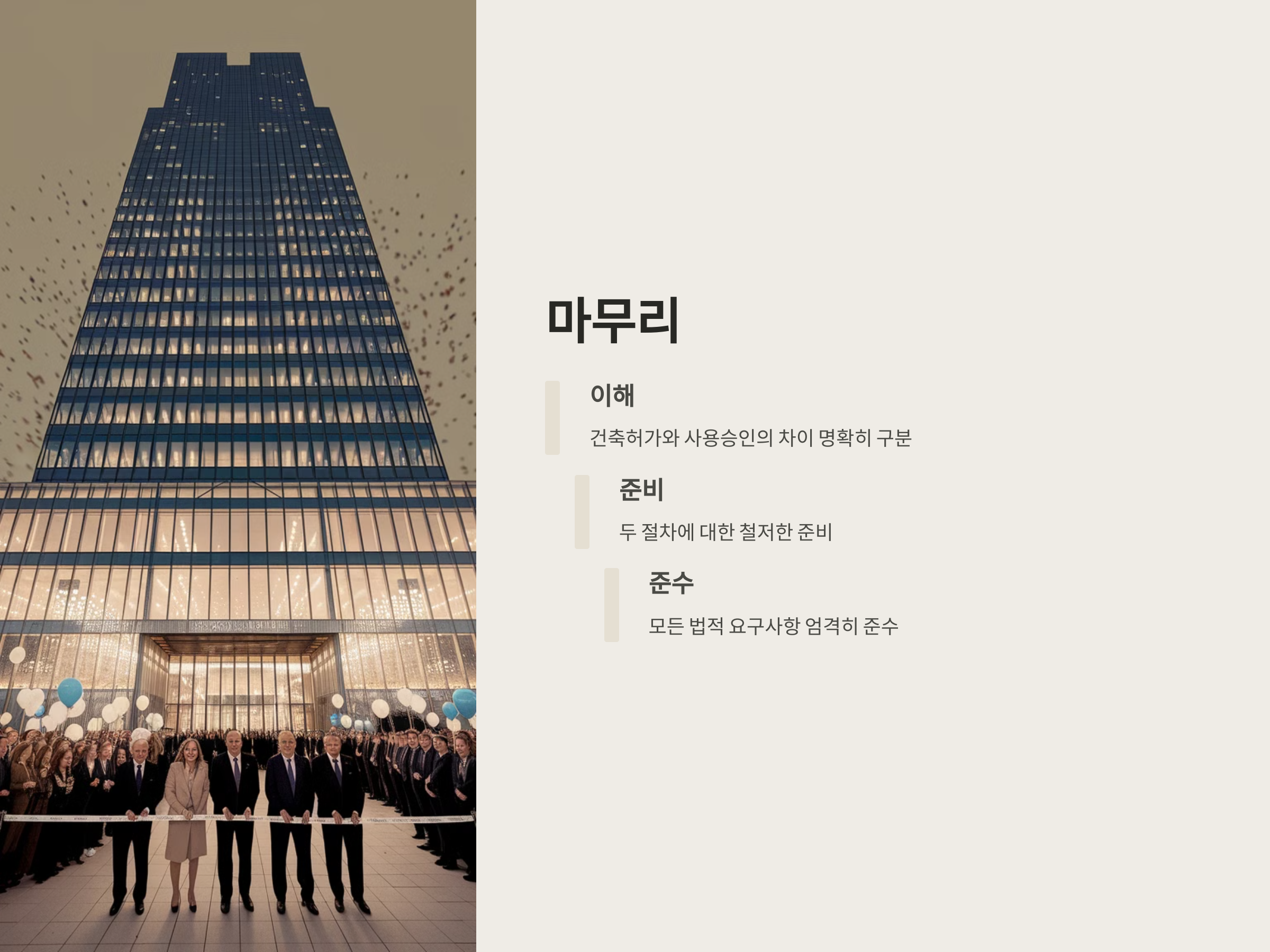 건축허가와 사용승인의 차이를 명확히 이해하고 구분하는 것이 중요합니다. 건축허가는 건축을 시작할 수 있도록 허가를 내주는 절차이며, 사용승인은 건축물이 안전하고 완벽하게 완공되었는지 확인하는 절차입니다. 이 두 가지 절차를 정확히 이해하고 철저히 준비하면, 불법 건축물이나 불편함을 피할 수 있습니다. 건축을 진행하는 모든 사람은 이러한 법적 요구사항을 반드시 준수해야 합니