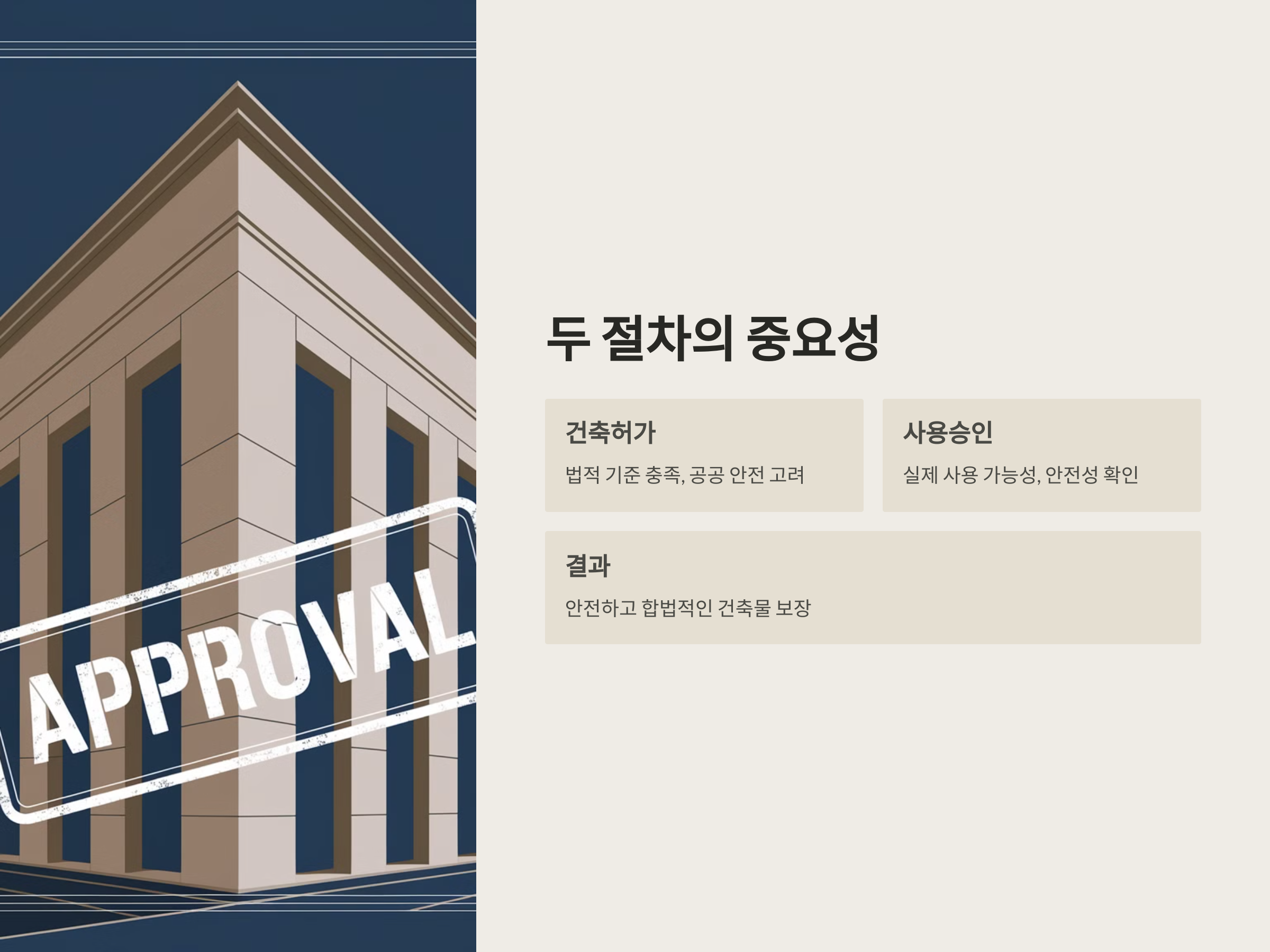 즉, 건축허가가 없으면 건축을 시작할 수 없고, 사용승인이 없으면 건축물의 사용이 불가능한 구조로 이어지므로, 이 두 절차는 모두 중요한 법적 요구사항입니다.