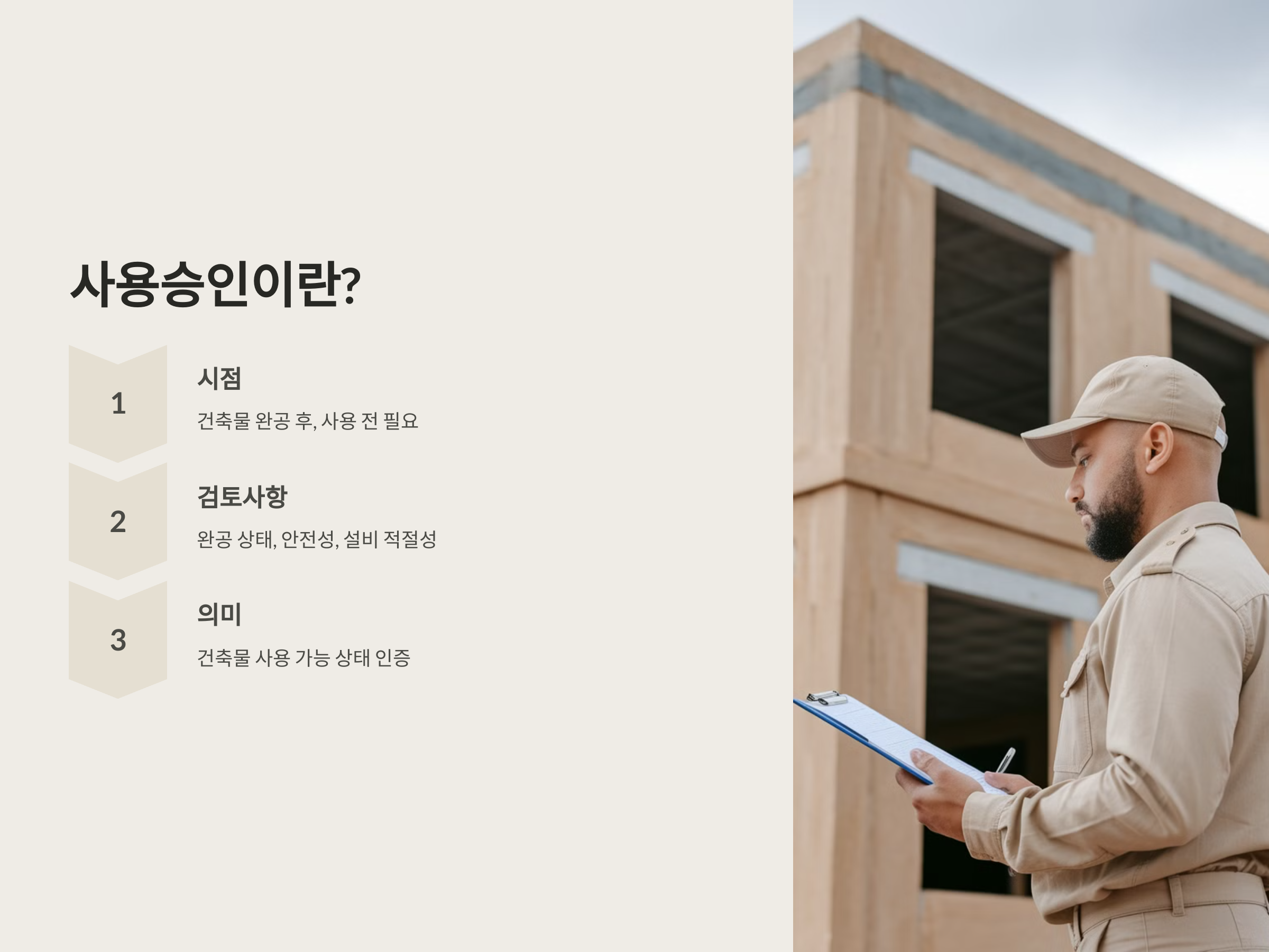 사용승인은 건축허가 후에 진행되는 절차로, 건축물이 완공된 뒤 사용을 시작하기 전에 필요한 승인입니다. 건축물이 설계대로 완공되었는지, 안전한지, 법적 기준을 충족하는지 등을 확인하는 절차입니다. 사용승인을 받지 않으면 건축물에 입주하거나 사용을 시작할 수 없습니다.