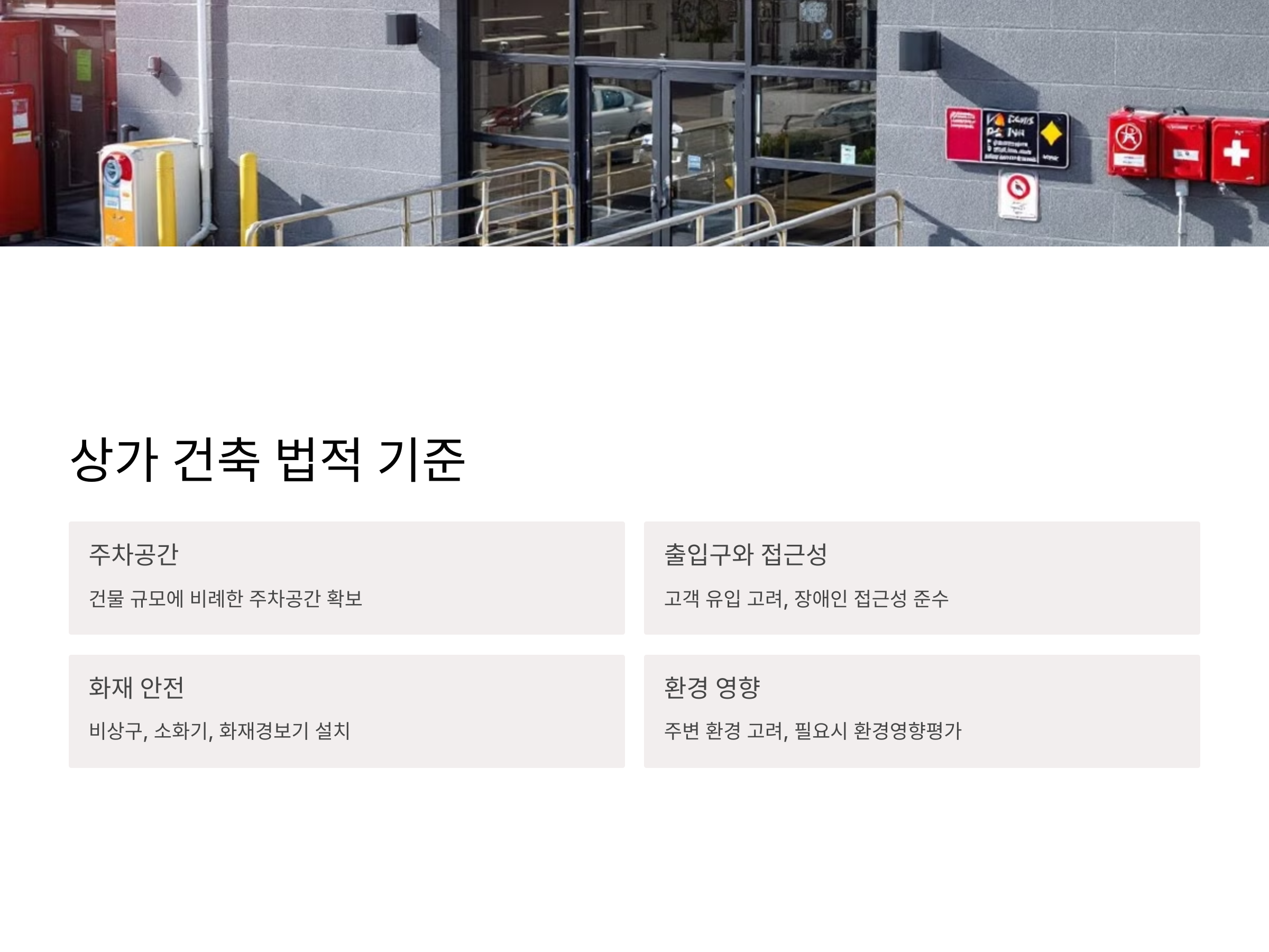 - 화재 안전: 상가는 많은 사람들이 모이는 공간이기 때문에 화재 안전 기준을 충족해야 합니다. 예를 들어, 비상구, 소화기, 화재경보기 등을 설치해야 하며, 이에 대한 법적 규제도 엄격히 적용됩니다.