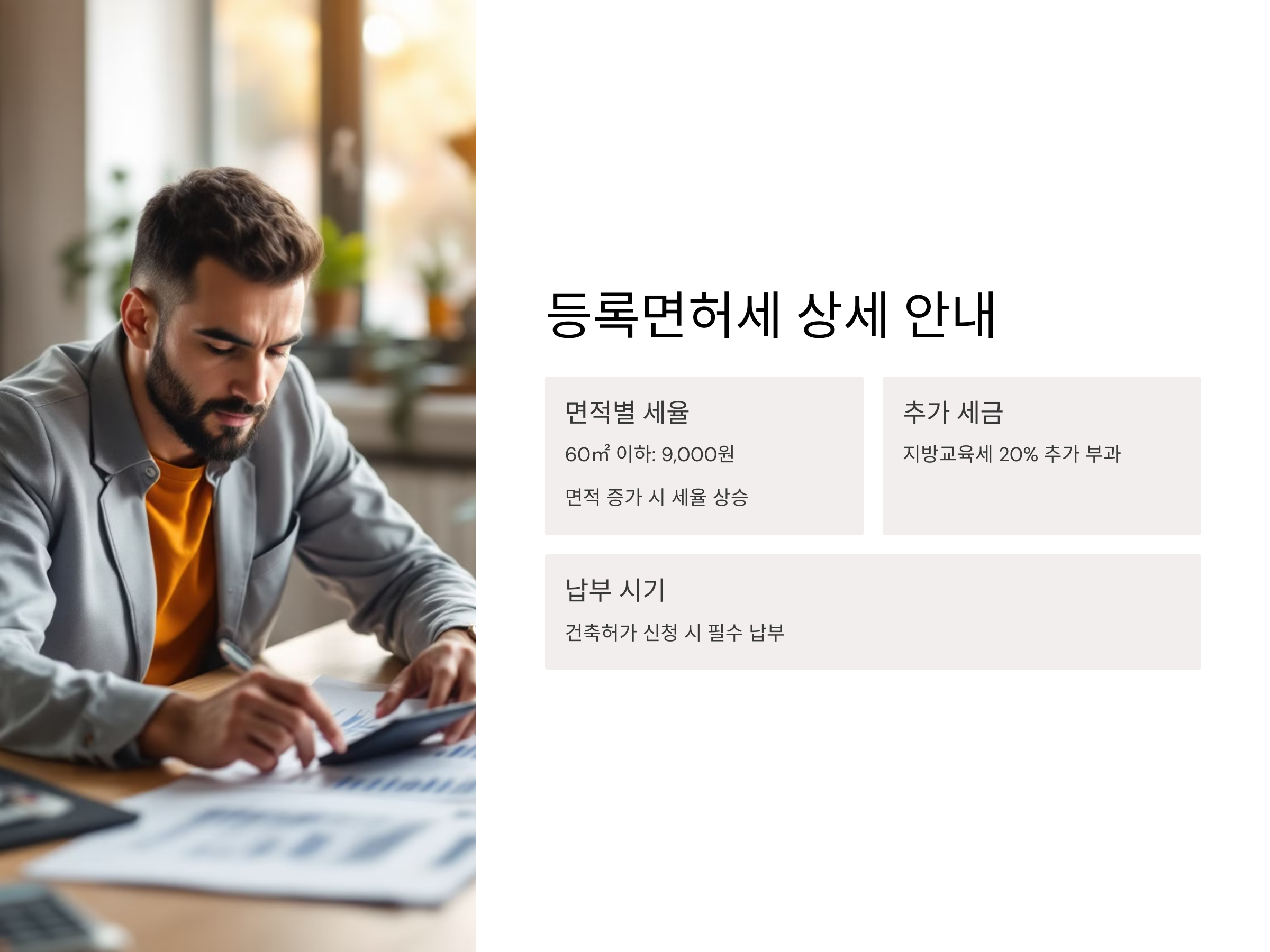 등록면허세는 건축허가를 받을 때 반드시 납부해야 하는 지방세로, 건축물의 규모와 용도에 따라 세율이 달라집니다. 예를 들어, 연면적 60㎡ 이하의 건축물은 9,000원의 등록면허세가 부과되며, 면적이 증가함에 따라 세율도 상승합니다. 또한, 등록면허세의 20%에 해당하는 지방교육세가 추가로 부과되므로, 이를 고려하여 예산을 계획해야 합니다.