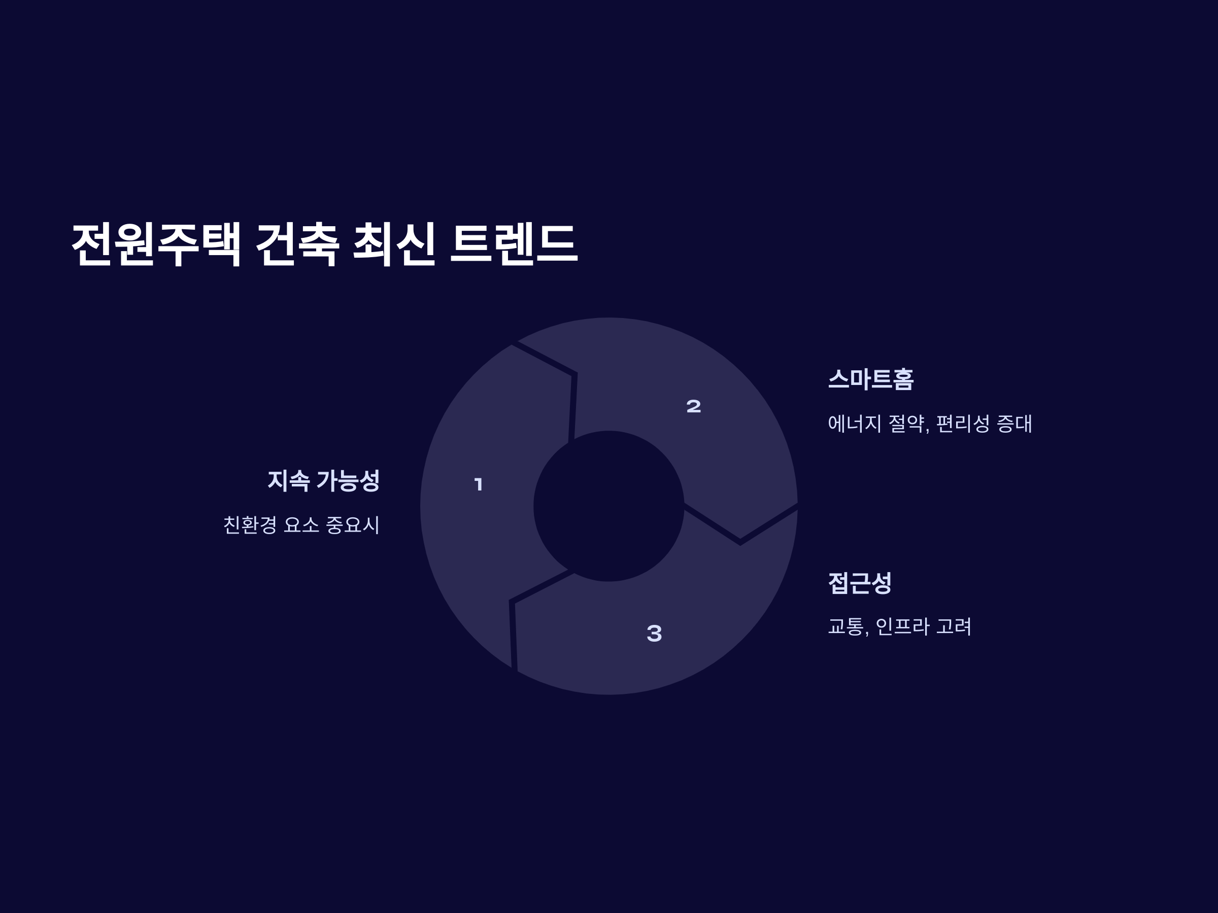 최근 전원주택 건축에서는 지속 가능성과 친환경적인 요소가 중요한 트렌드로 떠오르고 있습니다. 이에 따라 건축허가 절차에서도 환경 친화적인 건축물에 대한 요구가 증가하고 있습니다. 예를 들어, 태양광 패널, 지열 시스템, 비가시성 친환경 재료를 사용하는 등의 조건을 충족해야 합니다.
