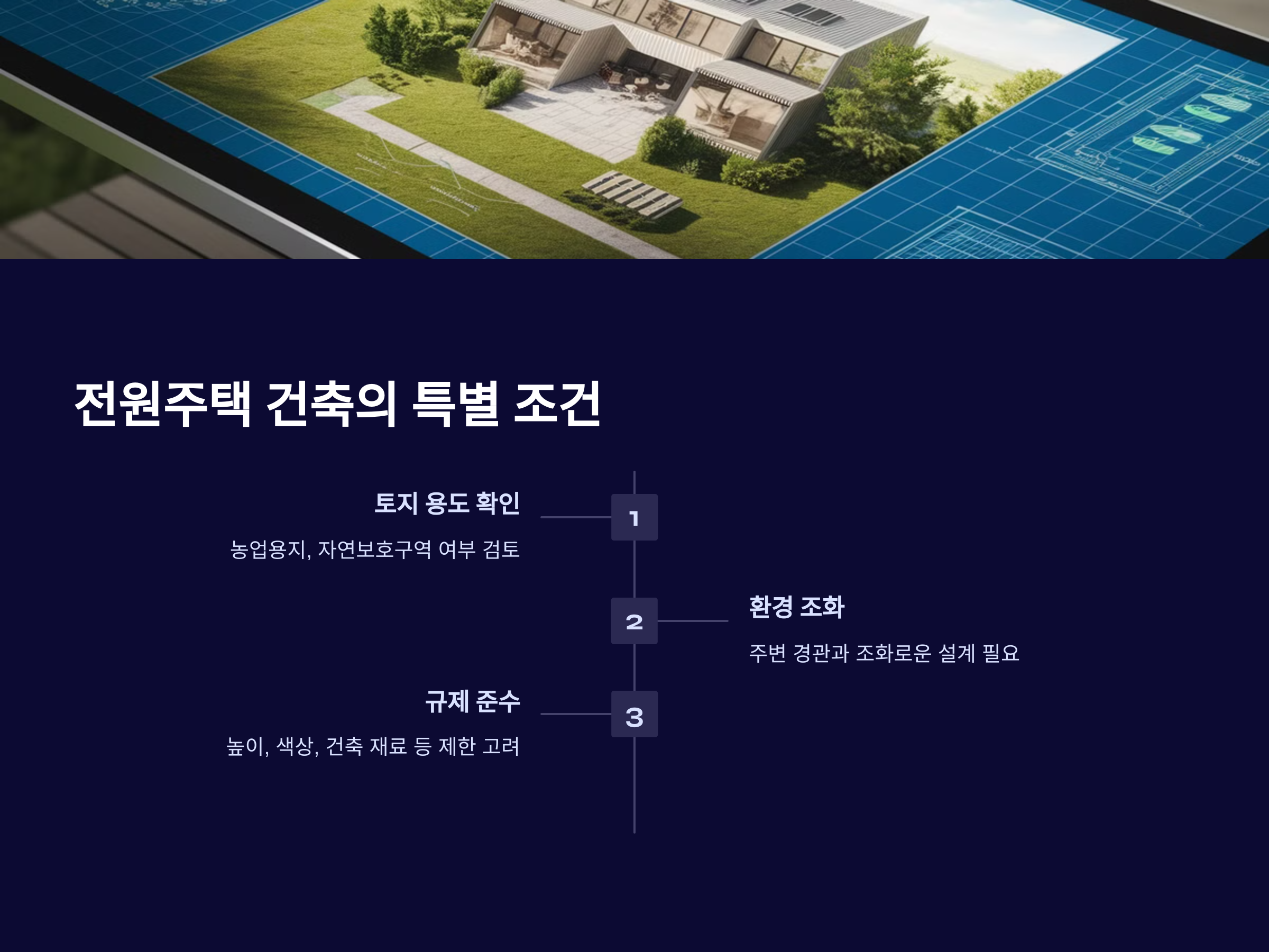 전원주택 건축은 일반적인 도시 주택과는 다른 절차와 조건을 따릅니다. 도심 외곽이나 농촌 지역에서 주택을 건축하는 경우, 해당 지역의 자연환경을 보호하고, 농업 및 산업용 토지에 대한 규제가 엄격하게 적용됩니다. 이 때문에 전원주택 건축을 위한 허가는 더욱 복잡하고 까다로울 수 있습니다.