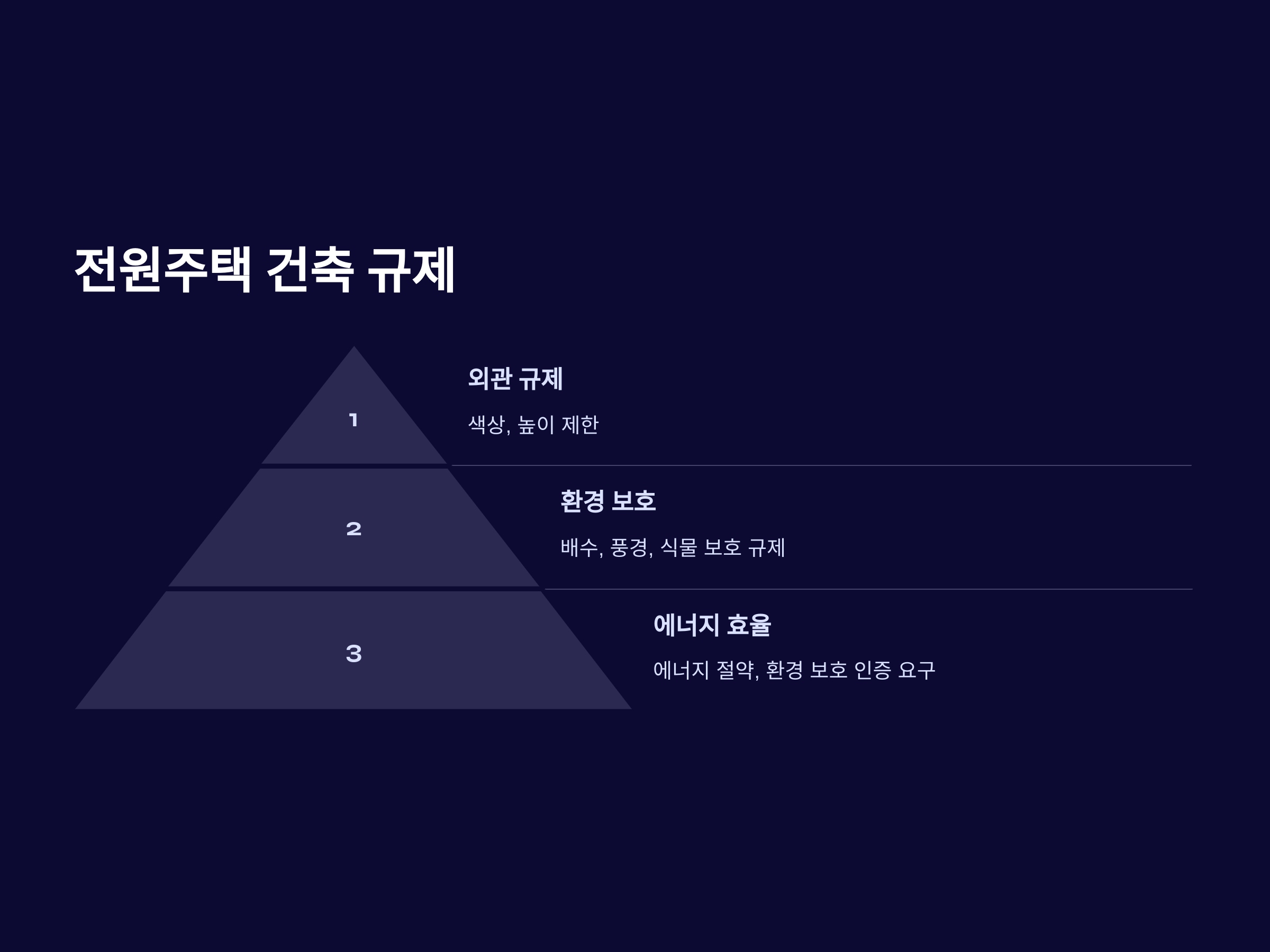 전원주택 건축을 위해서는 건축허가 외에도 여러 규제와 제약을 고려해야 합니다. 각 지역의 지자체는 전원주택 건축에 대해 다양한 규제를 두고 있으며, 이를 어길 경우 벌금이나 건축허가 취소 등의 처벌을 받을 수 있습니다.