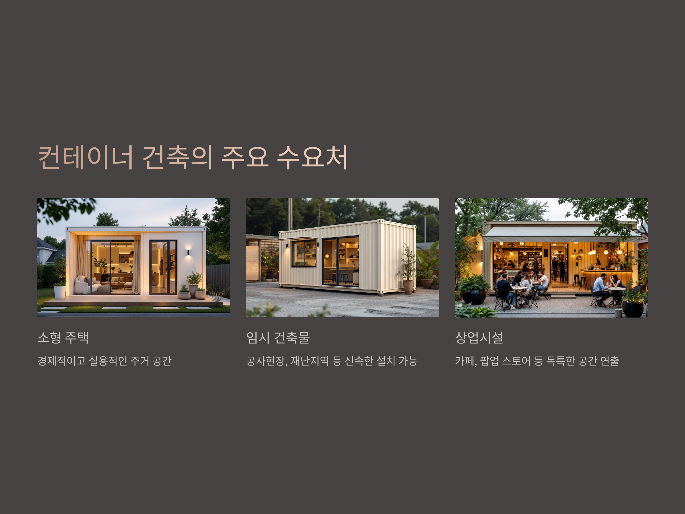 컨테이너 건축의 가장 큰 장점은 속도와 경제성입니다. 전통적인 건축 방식에 비해 공사 기간이 짧고, 비용이 절감되며, 환경 친화적인 건축 방법으로 주목받고 있습니다. 또한, 이동이 가능한 특성을 갖추고 있어 필요한 곳에 쉽게 설치하고 철거할 수 있다는 점에서도 큰 장점이 있습니다.