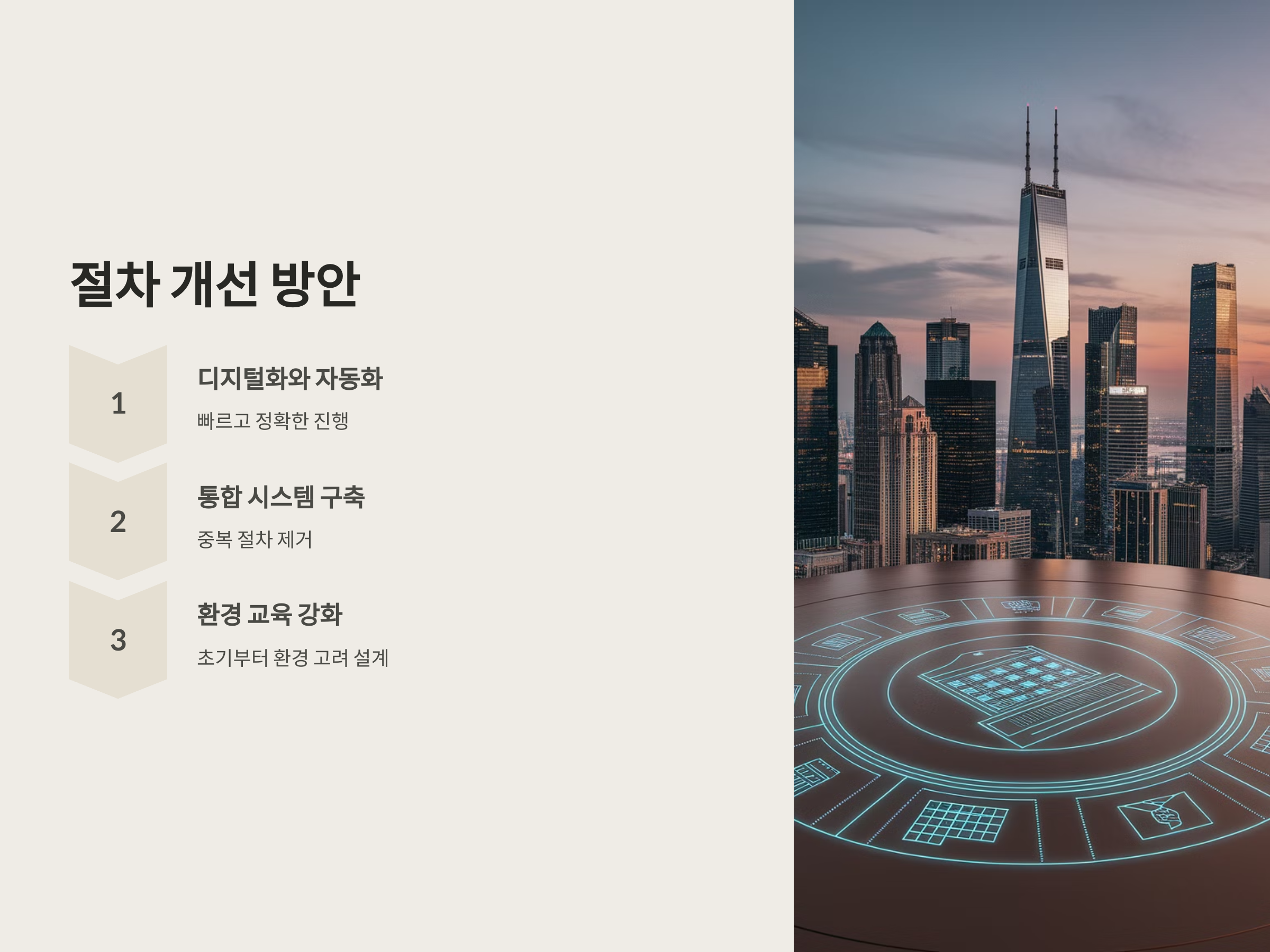 - 통합 시스템 구축: 건축허가와 환경영향평가를 동시에 진행할 수 있는 통합 시스템을 구축하여, 각 절차가 서로 중복되지 않도록 합니다. 이를 통해 건축과 환경 평가가 동시에 이루어져 시간을 절약할 수 있습니다.
