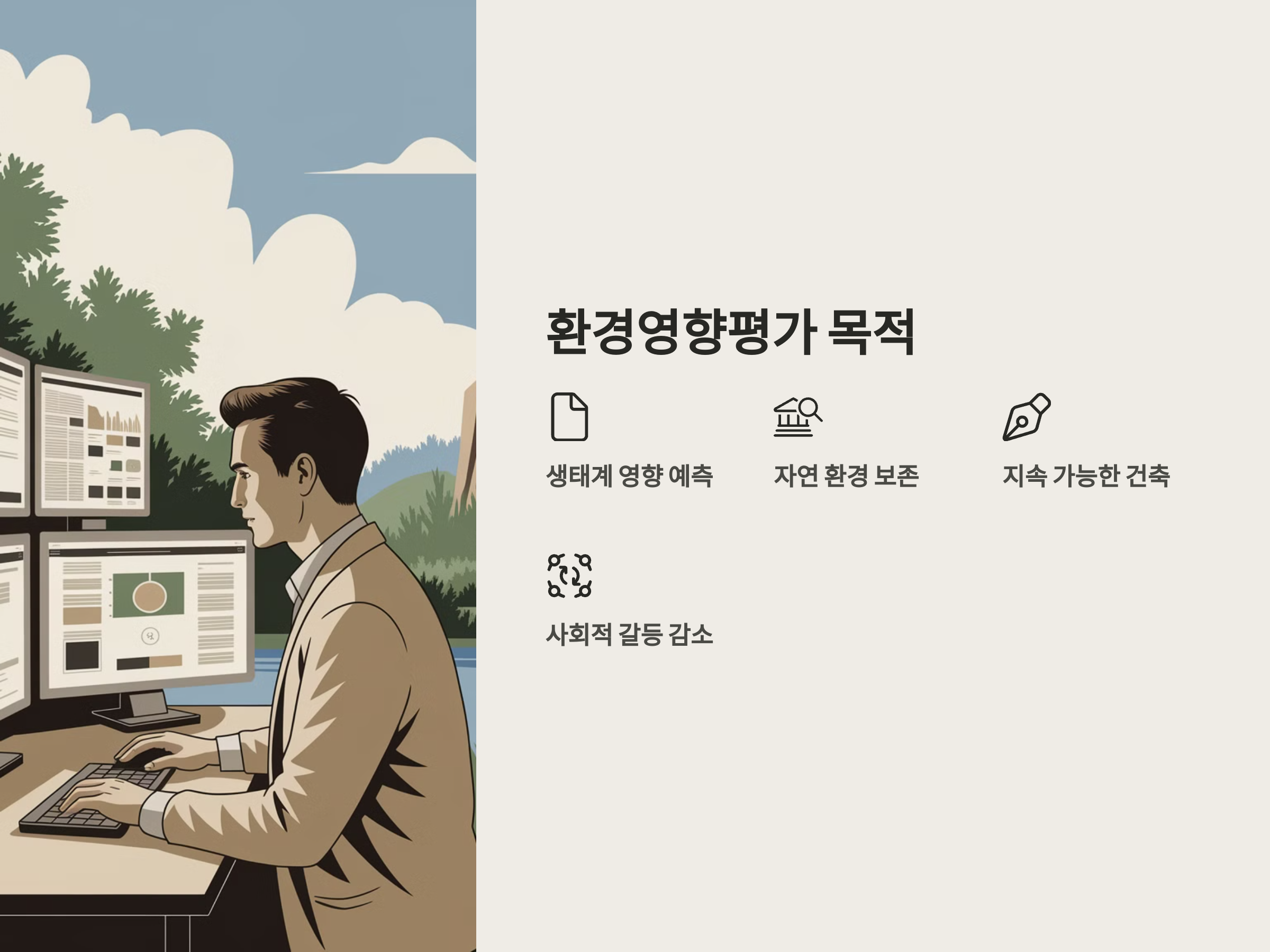 - 환경 보호: 건축과 개발 프로젝트가 자연 환경에 미치는 영향을 미리 예측하고, 이를 최소화할 수 있는 방법을 마련하는 과정입니다. 이는 지속 가능한 개발을 위해 매우 중요합니다.
