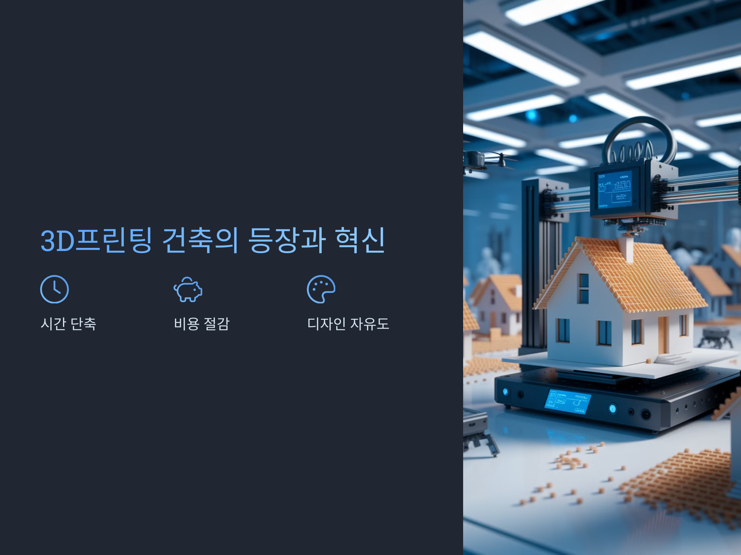 - 시간 단축: 3D프린팅 기술은 건축물을 빠르게 제작할 수 있어, 기존의 건축방식보다 훨씬 짧은 시간 안에 건축물이 완공될 수 있습니다.