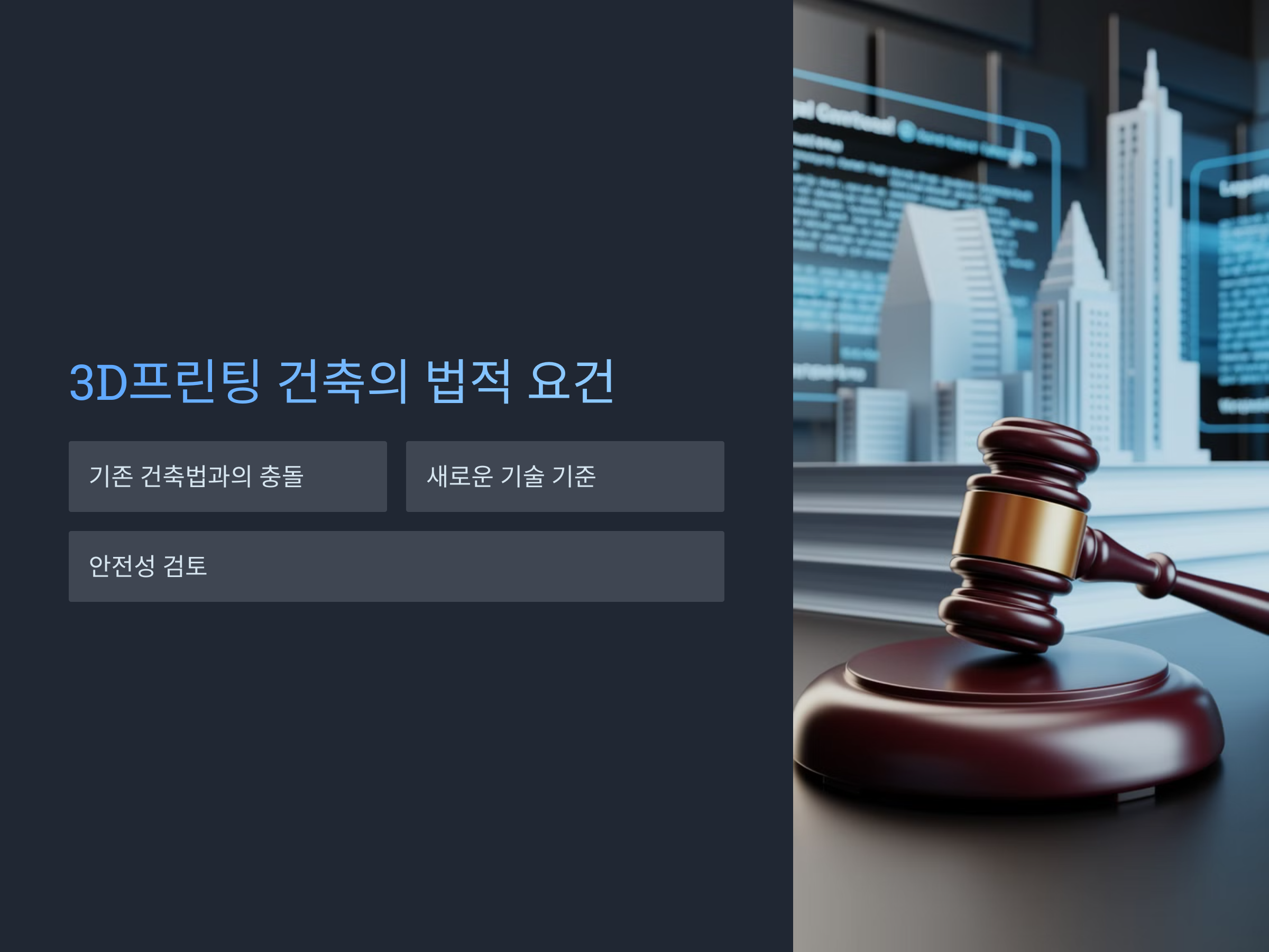 - 기존 건축법과의 충돌: 기존 건축법은 전통적인 건축 방식에 맞춰져 있기 때문에, 3D프린팅 건축물의 설계와 시공 방식이 기존 법과 충돌할 가능성이 있습니다. 이는 건축허가 절차에 새로운 법적 검토가 필요함을 의미합니다.