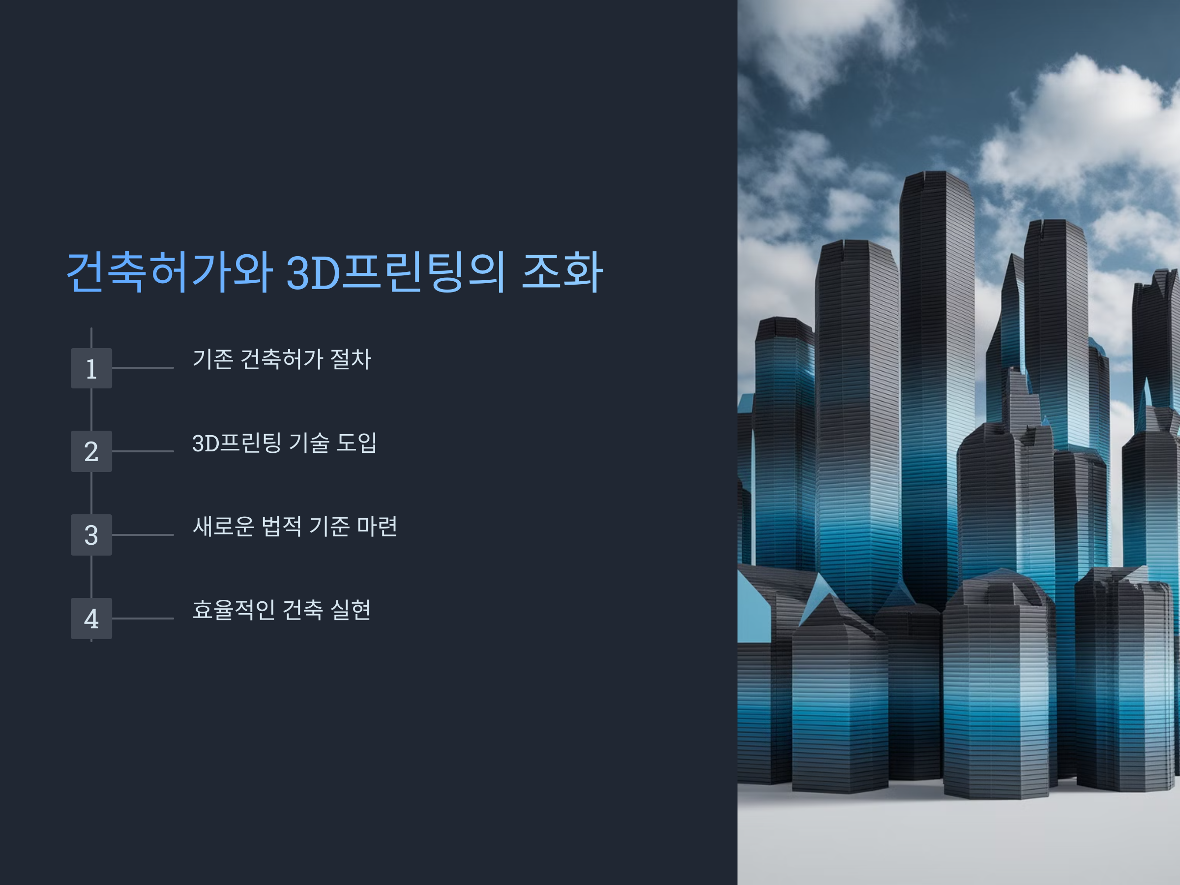 이와 같은 장점은 건축허가 절차에서도 중요한 변화를 예고합니다. 3D프린팅 건축물은 기존 건축물과는 다른 형태와 재료를 사용할 수 있기 때문에, 새로운 허가 기준이 필요할 수 있습니다. 또한, 3D프린팅 기술로 인해 건축허가 심사 과정에서 더 많은 기술적 고려사항이 추가될 가능성이 있습니다.