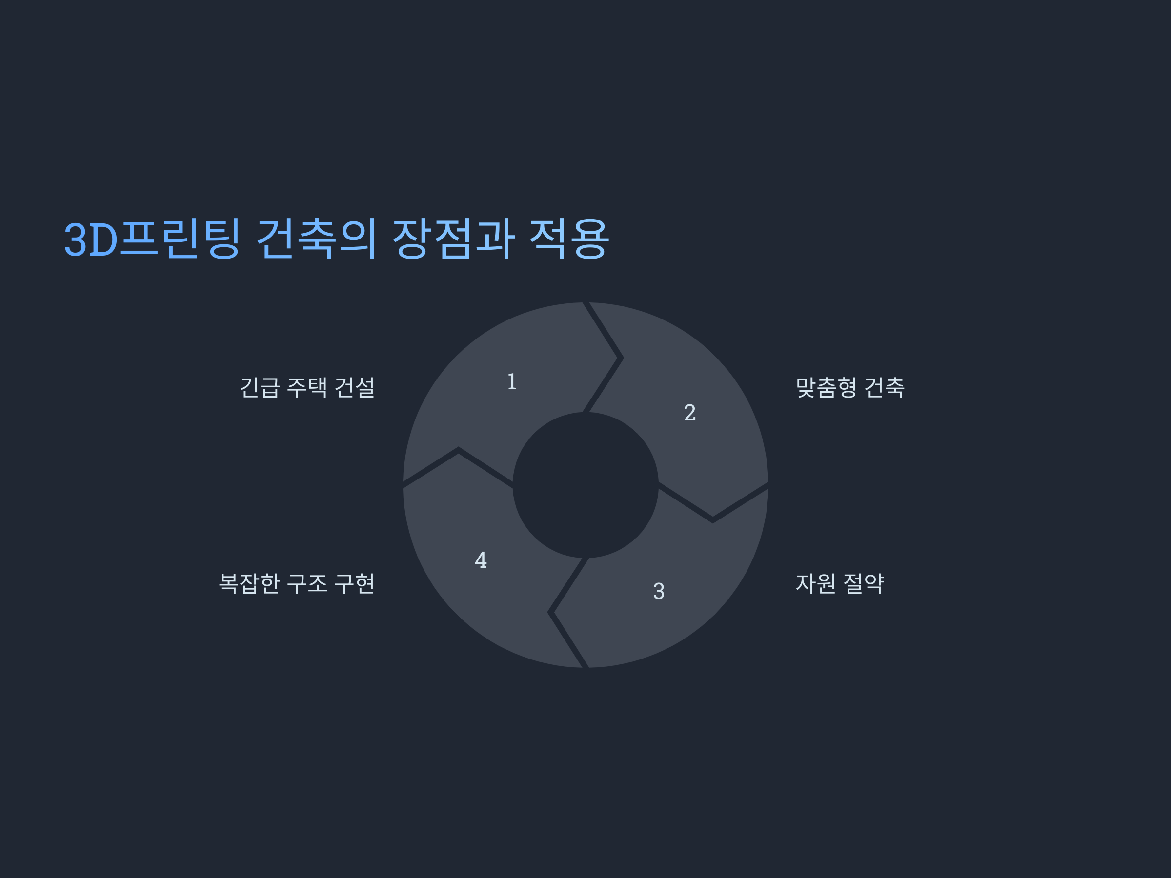 3D프린팅 건축은 여러 분야에서 장점을 발휘할 수 있으며, 특히 빠른 건설과 저렴한 비용으로 주목받고 있습니다. 이미 일부 국가에서는 3D프린팅 기술을 활용하여 주택을 건설하거나, 다양한 공공건물을 만드는 프로젝트를 진행 중입니다.