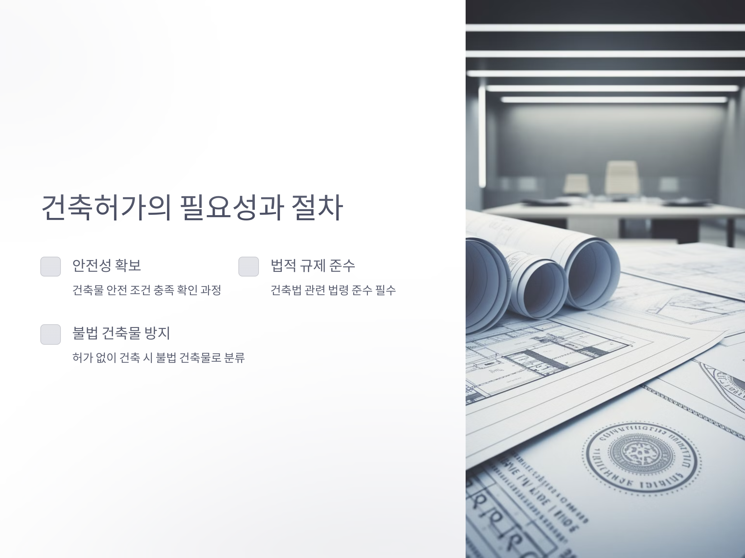 이처럼 건축허가는 안전성 및 법적 규제 준수를 위한 중요한 절차이므로, 절대로 건축허가 없이 건축 작업을 시작해서는 안 됩니다.