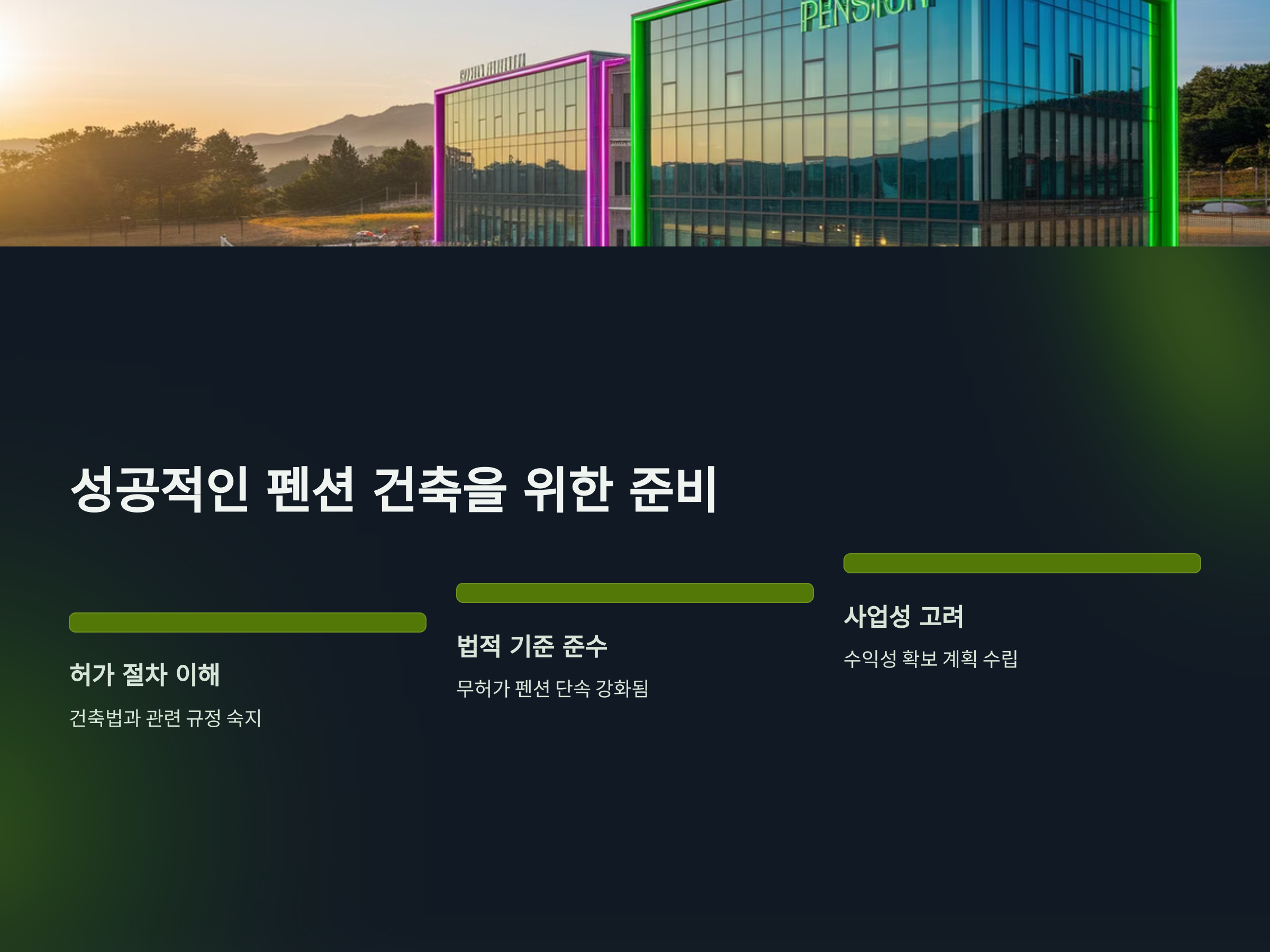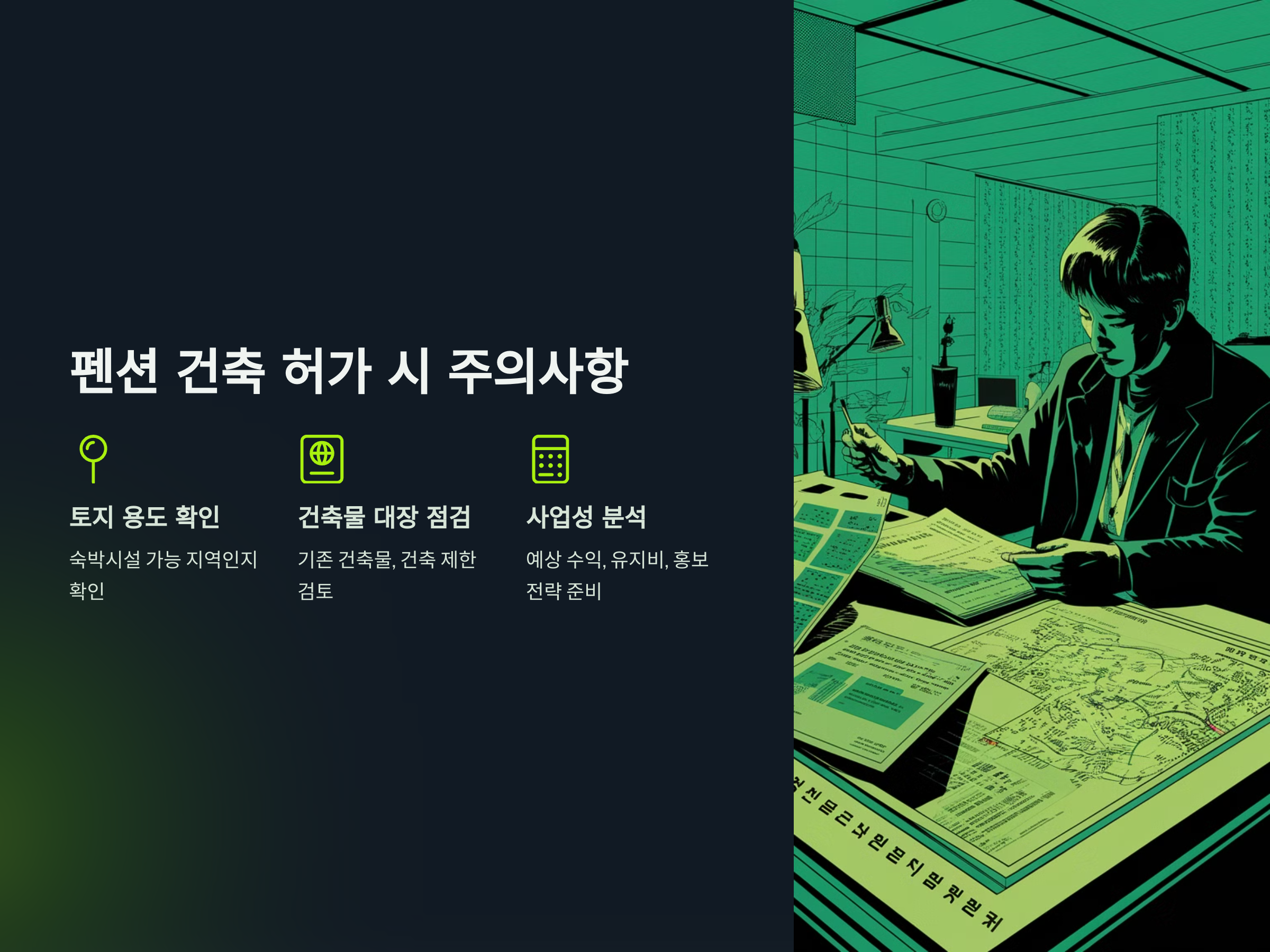 펜션을 건축하려면 일반 건축물보다 더 많은 법적 절차를 거쳐야 하므로, 주요 유의사항을 반드시 숙지해야 합니다.
