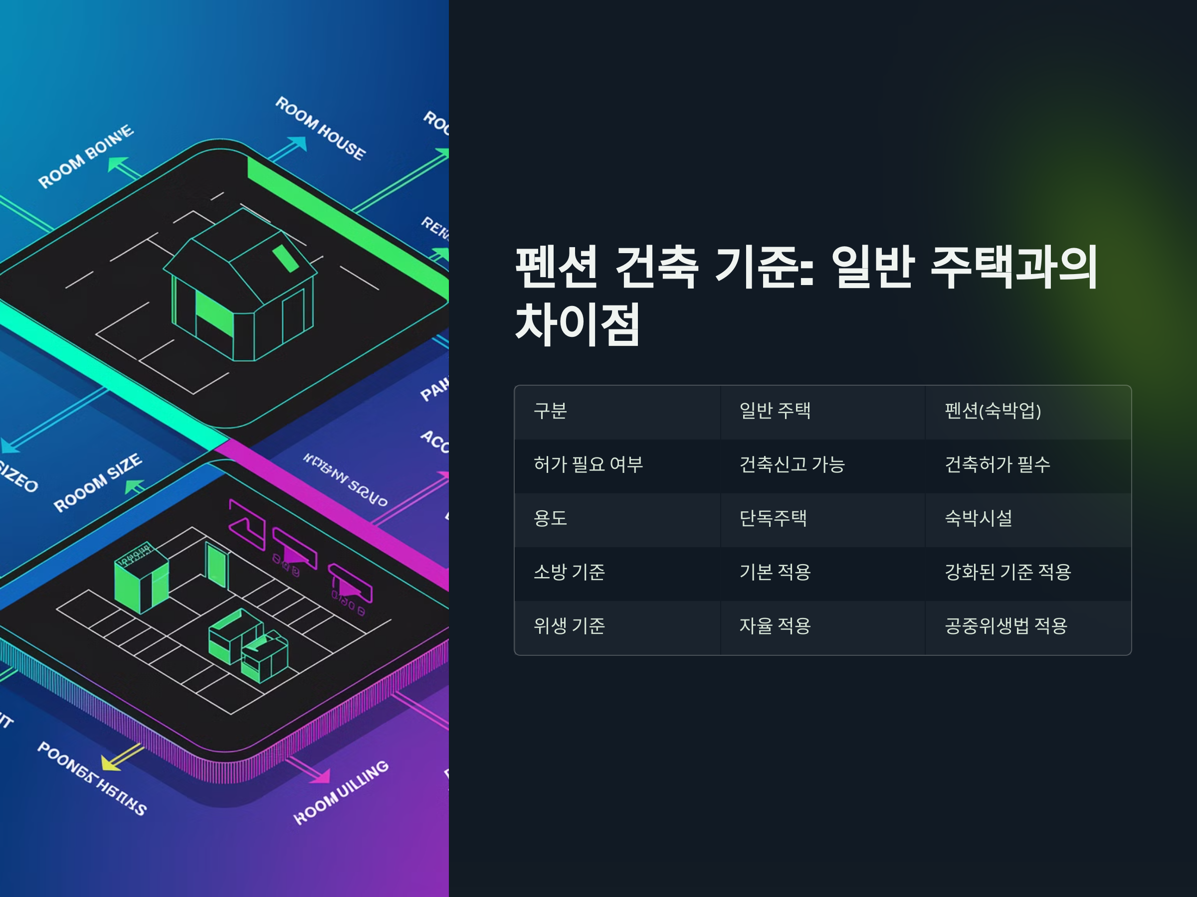 펜션 건축은 일반 주택과 달리 관광진흥법 및 숙박업 관련 규정을 추가적으로 따라야 합니다. 특히 허가를 받기 위해서는 건축법과 관련 규정을 철저히 숙지해야 합니다.