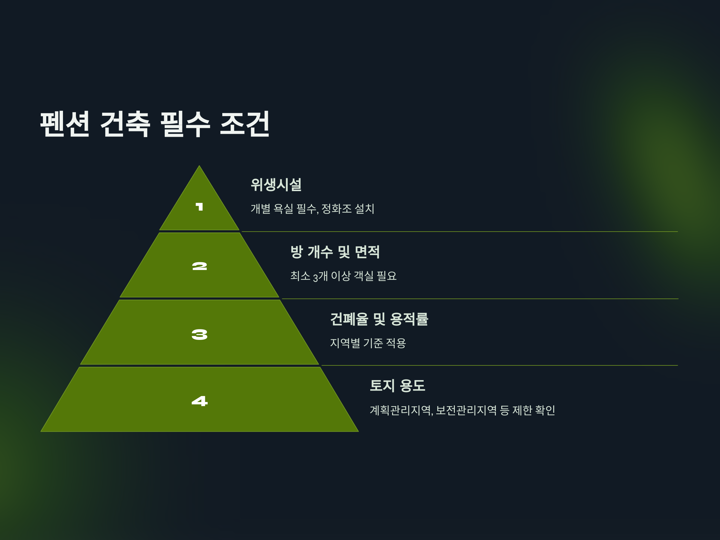 펜션을 건축하려면 숙박업으로 등록해야 하기 때문에, 건축허가 외에도 위생·소방·환경 관련 법률을 준수해야 합니다.