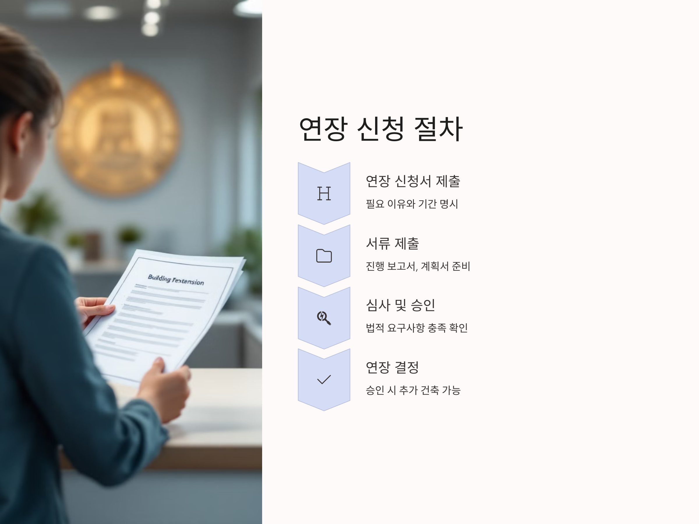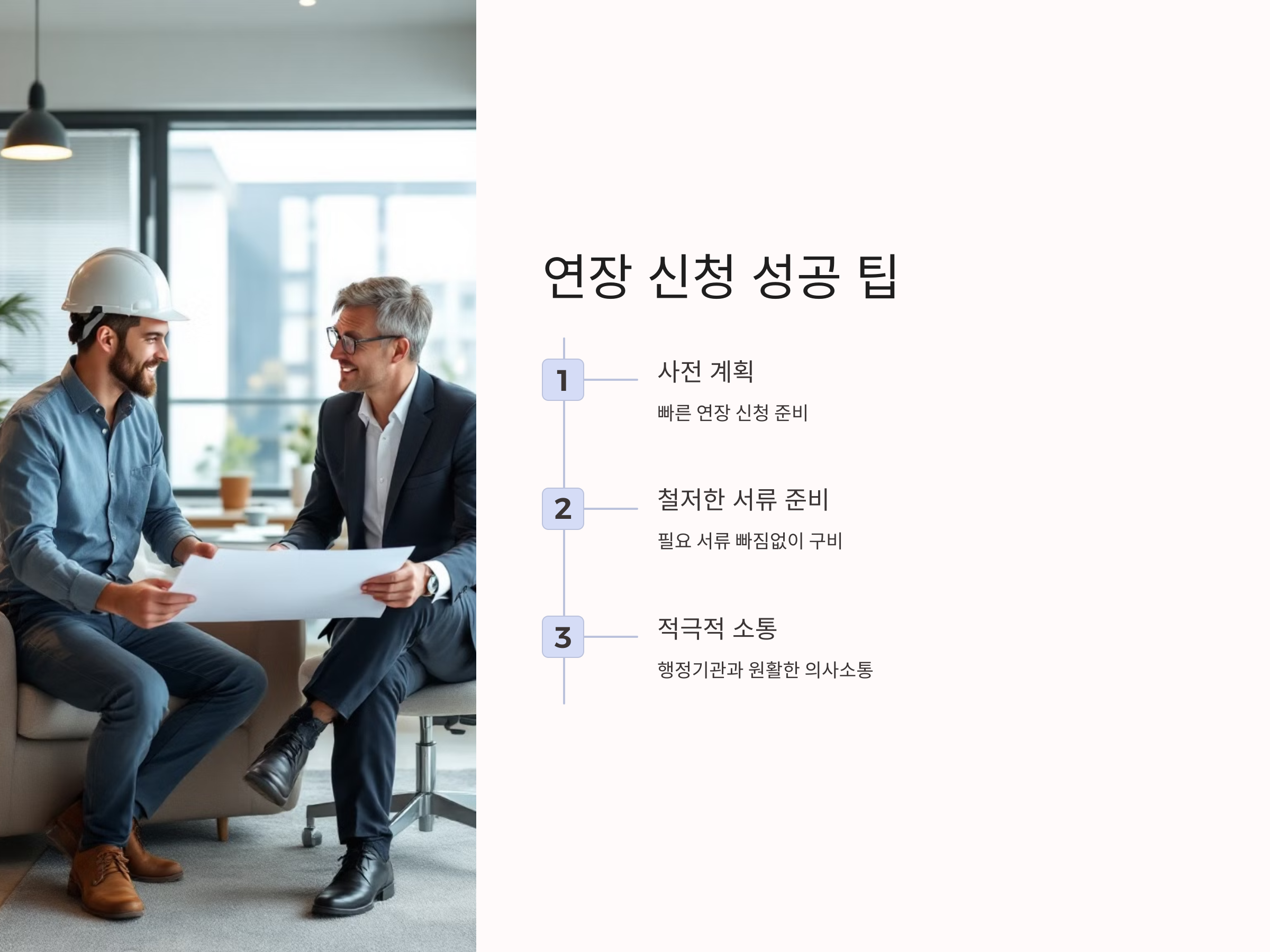 - 서류 준비: 연장 신청서를 포함한 필요한 서류를 빠짐없이 준비하고, 공사 진행 상황이나 설계 변경 사항을 명확히 기재합니다.