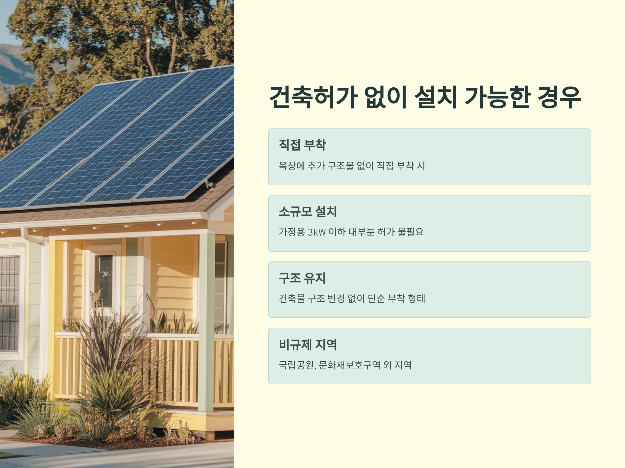 - 가정용 태양광 발전(3kW 이하)은 대부분 별도의 건축허가 없이 설치가 가능합니다.