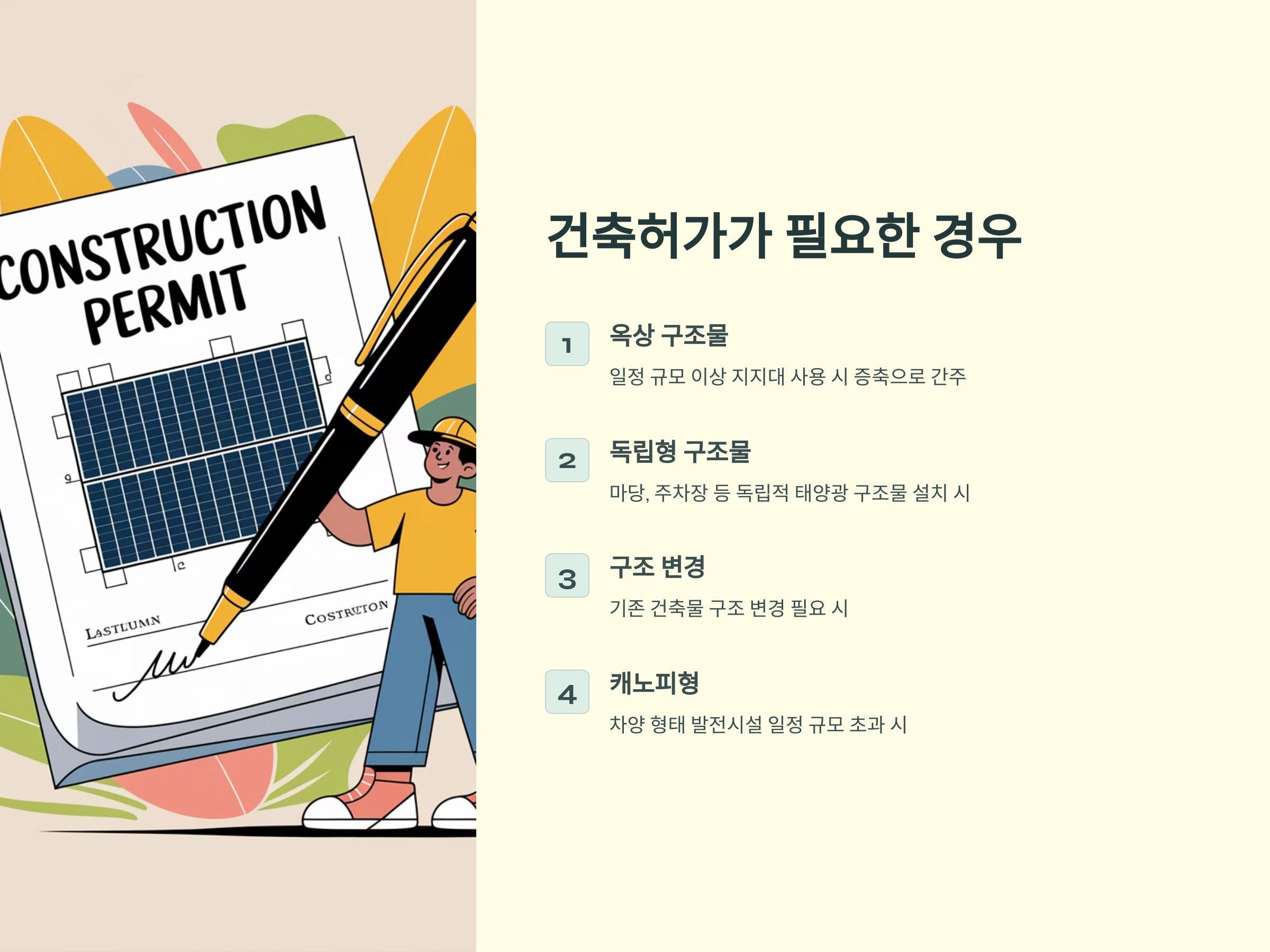 - 태양광 패널 설치로 인해 기존 건축물의 구조를 변경해야 하는 경우, 건축허가가 필요할 수 있습니다.