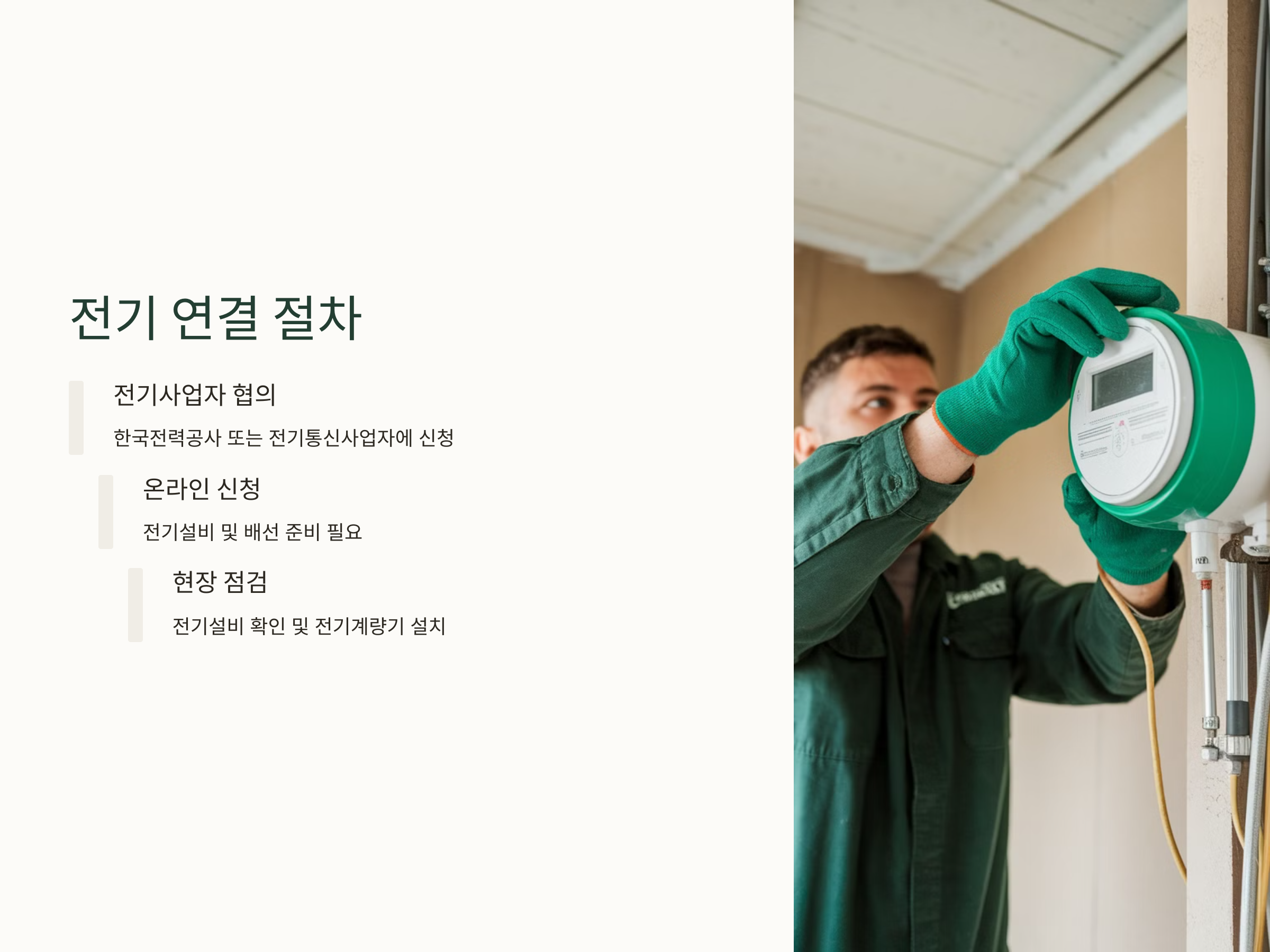 전기 연결 절차가 완료되면 전기사용 계약을 맺어야 하며, 그 후 정상적으로 전기를 사용할 수 있습니다. 이 과정에서 주의해야 할 점은 전기 설비가 제대로 설치되었는지, 안전 기준에 맞는지 점검을 철저히 해야 한다는 점입니다.