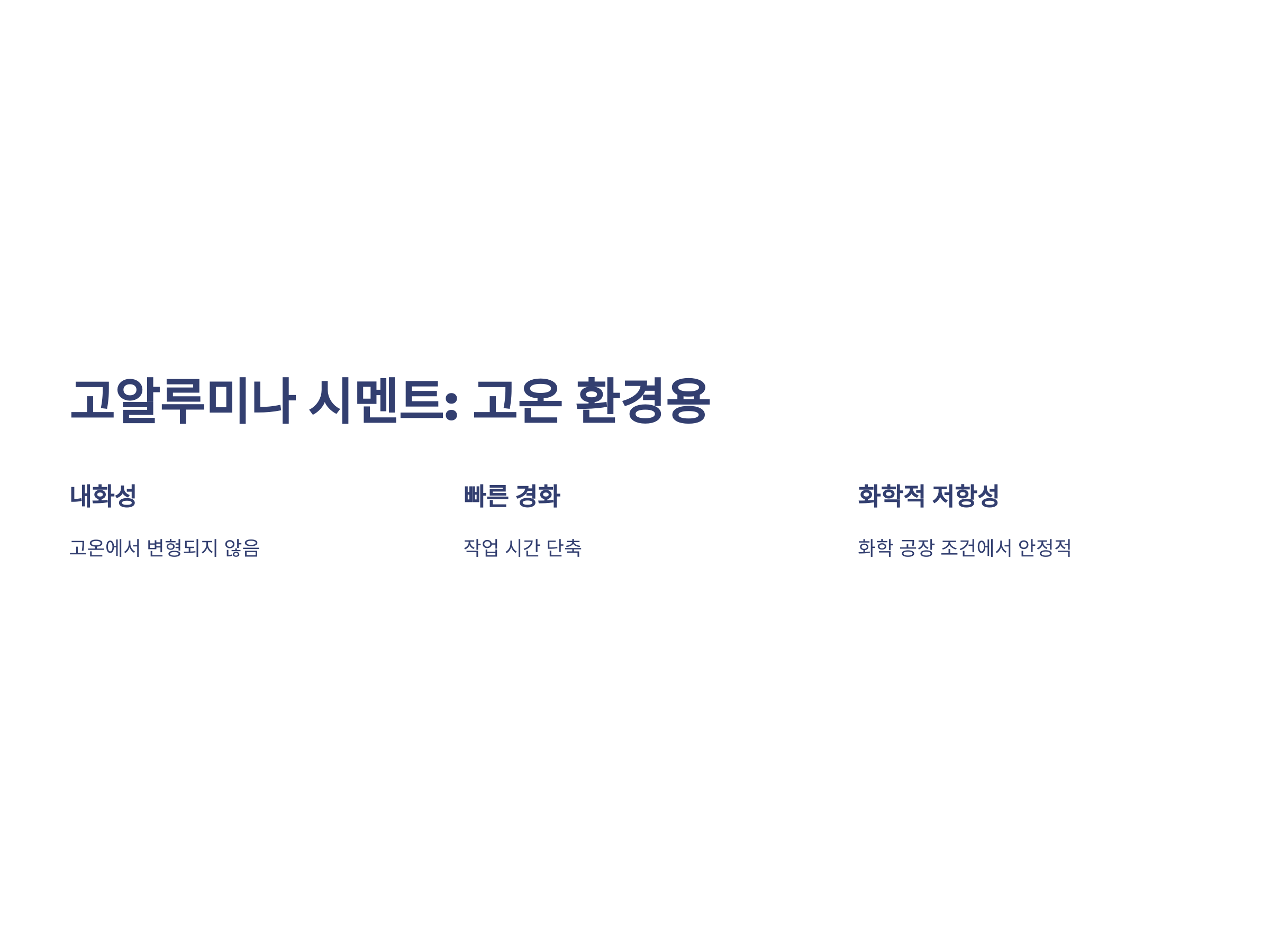 - 강도: 일반 포틀랜드 시멘트와 유사한 물리적 특성.