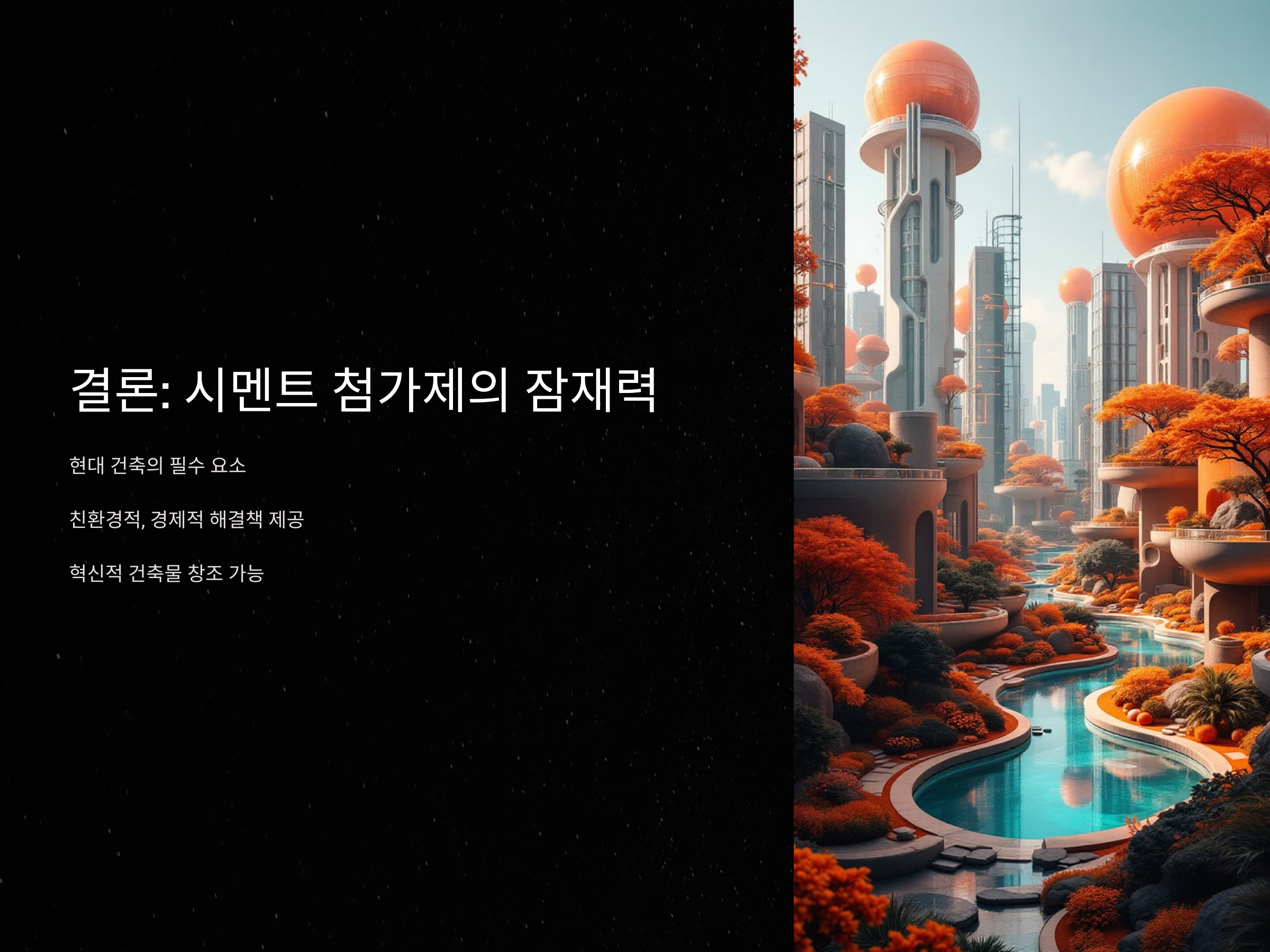 - 스마트 콘크리트: 자가 복원 기능을 가진 첨가제 연구가 활발히 진행되고 있습니다.