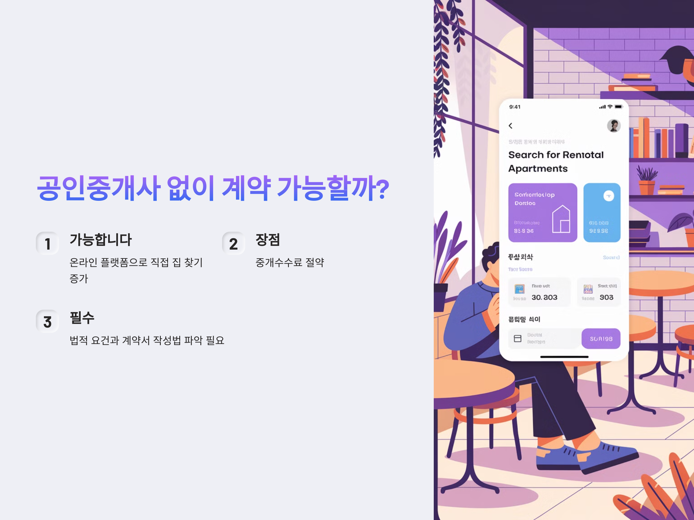 공인중개사 없이 월세 계약을 진행하는 것이 불가능한 것은 아닙니다. 오히려 요즘은 온라인 플랫폼이나 부동산 앱을 통해 직접 집을 찾는 사람들이 많아지고 있습니다. 중개수수료를 아끼고 싶거나, 직접 집주인과 계약을 원하시는 분들에게는 공인중개사 없이 계약을 진행하는 것이 하나의 대안이 될 수 있습니다. 그러나 이를 위해서는 법적 요건이나 계약서 작성 방법 등 중요한 요소들을 미리 파악하고 진행하는 것이 중요합니다.