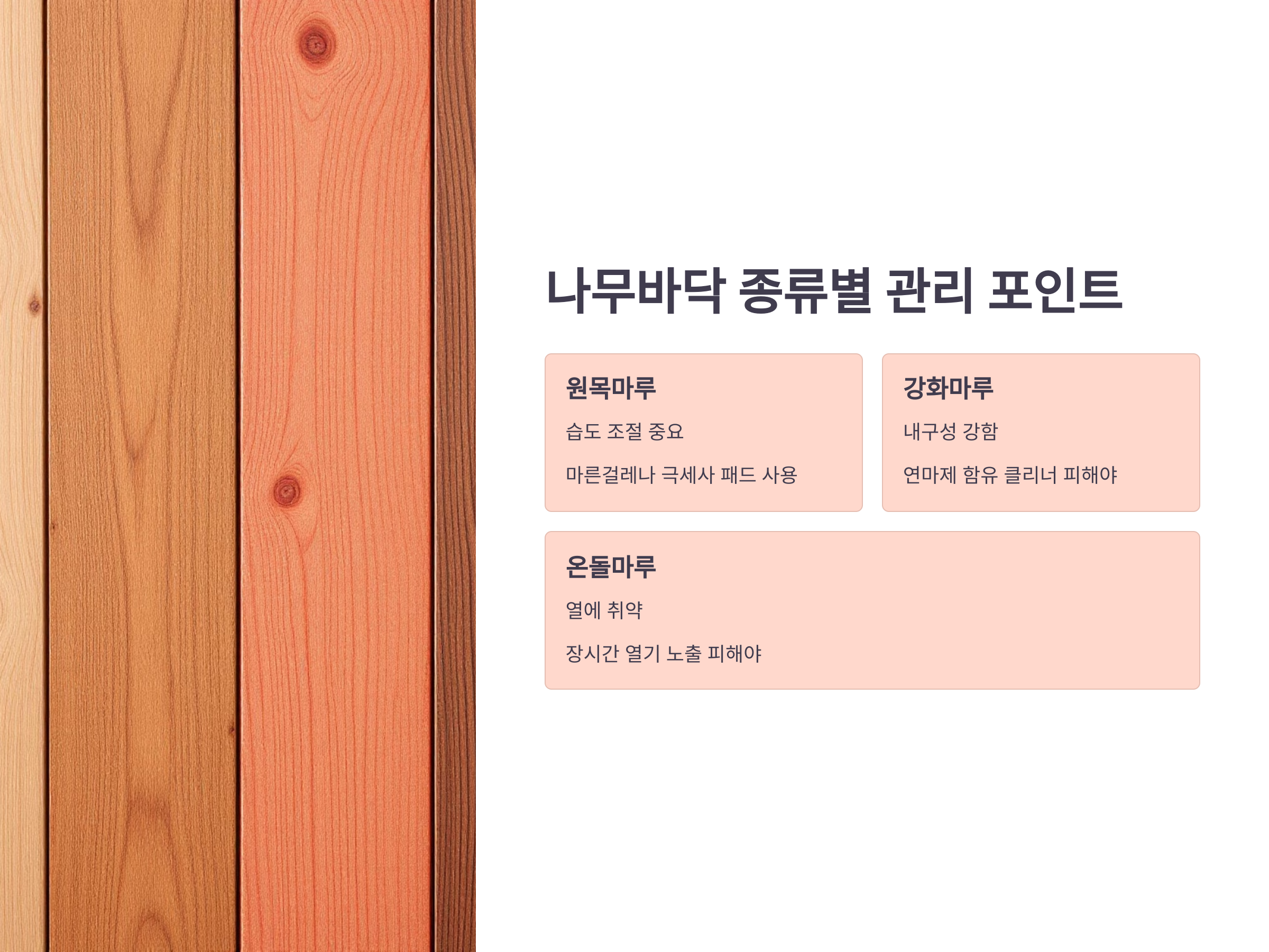나무바닥은 크게 원목마루, 강화마루, 합판마루(온돌마루)로 나눌 수 있습니다. 각각의 재질 특성과 마감 방식에 따라 적절한 관리법이 달라지며, 잘못된 방법은 오히려 표면 손상을 유발할 수 있습니다.