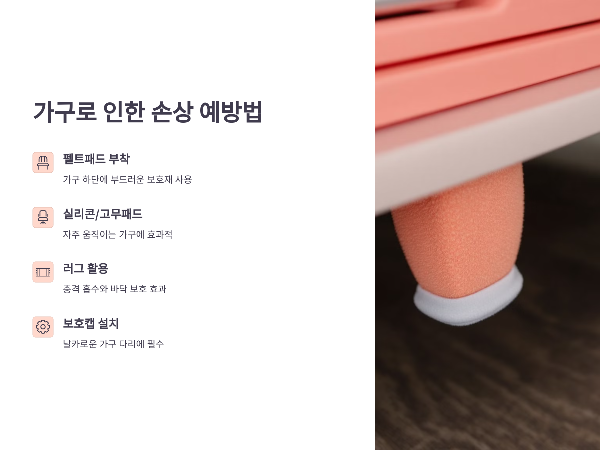 특히 식탁, 의자처럼 자주 움직이는 가구에는 부드러운 실리콘 패드나 고무패드를 사용하는 것이 효과적이며, 무거운 가구는 이동 전 반드시 하단 보호를 위한 도구를 사용하는 것이 바람직합니다. 가구 다리의 날카로운 마감처리도 점검하여 필요시 보호캡을 부착하는 것이 좋습니다.