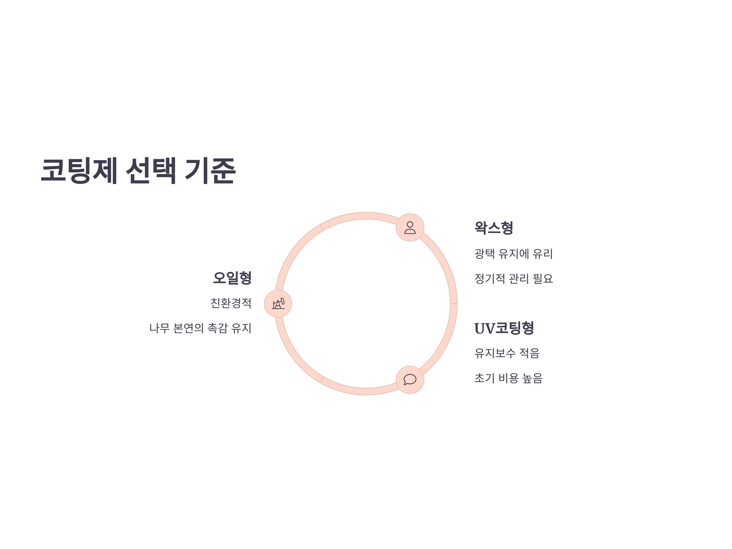 코팅제는 크게 왁스형, 오일형, UV코팅형 등이 있으며, 각각 장단점이 뚜렷하므로 바닥재 특성과 사용환경에 따라 선택해야 합니다. 오일형은 친환경적이고 나무 본연의 촉감을 살릴 수 있는 장점이 있으며, 왁스형은 광택 유지에 유리하지만 정기적인 관리가 필요합니다. UV코팅형은 유지보수가 적은 대신 초기 시공비용이 높을 수 있습니다.