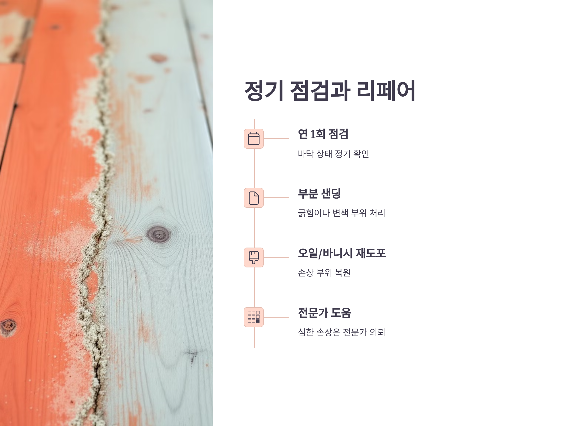 보통 1년에 한 번은 바닥 상태를 점검하고, 긁힘이나 변색 부위가 있다면 해당 부분만 샌딩 후 오일이나 바니시를 재도포하는 방식으로 관리합니다. 심한 손상은 전문가의 도움을 받아 리페어 또는 일부 교체가 필요할 수 있습니다.