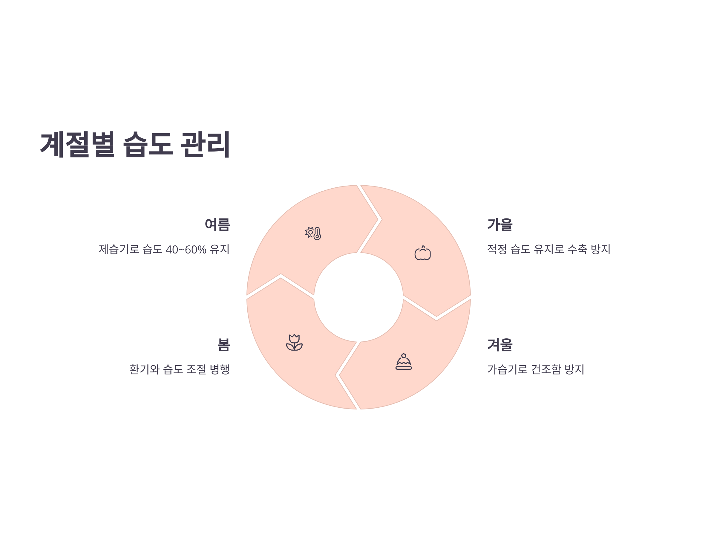 여름철엔 제습기를 활용하여 실내 습도를 40~60% 사이로 유지하는 것이 중요하며, 겨울철에는 가습기를 사용하여 건조함을 방지해주는 것이 좋습니다. 너무 낮은 습도에서는 바닥 틈이 벌어지고, 너무 높은 습도에서는 표면이 들뜨거나 변형이 일어날 수 있습니다.