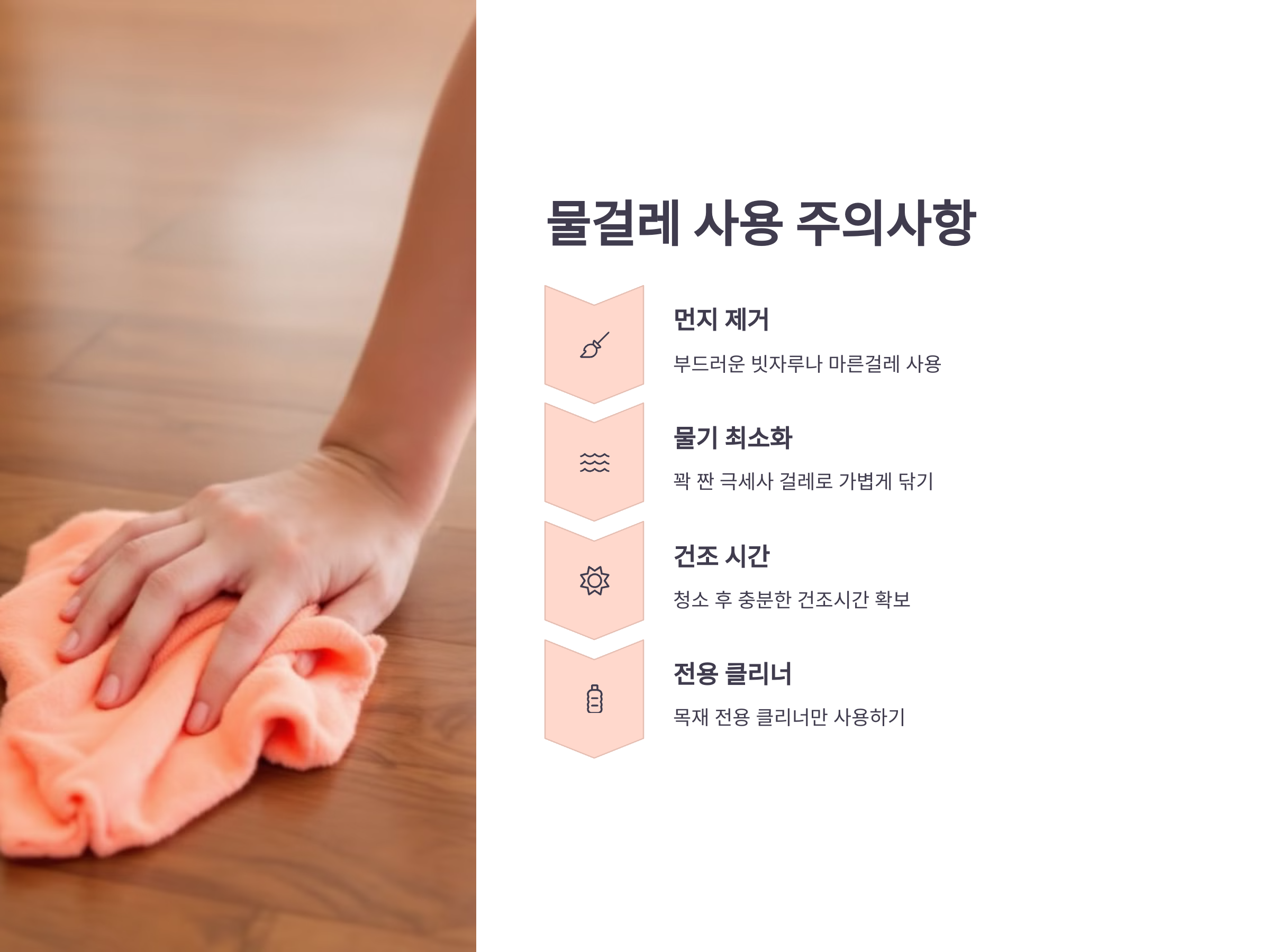 먼저 먼지를 제거할 땐 부드러운 빗자루나 마른걸레, 혹은 정전기 청소포를 사용하는 것이 가장 좋습니다. 그리고 청소가 필요할 경우, 물에 적신 후 꽉 짠 극세사 걸레로 가볍게 닦는 정도로만 유지해야 하며 절대 물기를 남기지 않아야 합니다. 특히 마루 틈 사이에 물이 들어가면 부풀거나 틈이 벌어질 수 있으므로 청소 후 반드시 건조시간을 확보해야 합니다.