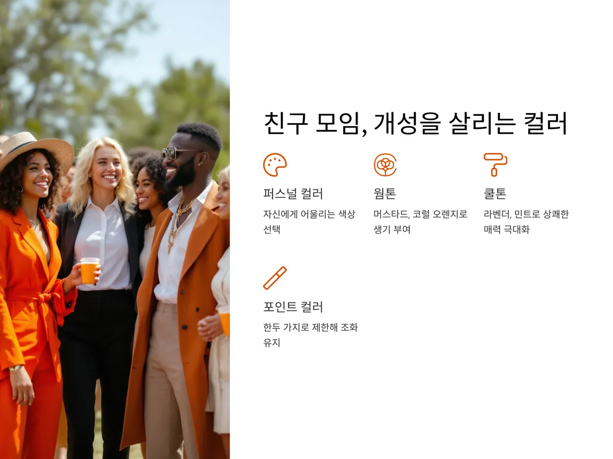 친구들과의 기념일 모임에서는 자유로움과 개성을 드러낼 수 있는 컬러가 좋습니다. 요즘 인기 있는 퍼스널 컬러 진단을 참고해 자신에게 잘 어울리는 색을 선택하면, 자연스럽게 돋보일 수 있습니다. 예를 들어, 웜톤에게는 머스타드 옐로우나 코럴 오렌지가 생기있고 따뜻한 인상을 줄 수 있으며, 쿨톤에게는 라벤더나 민트 컬러가 상쾌한 매력을 극대화합니다.