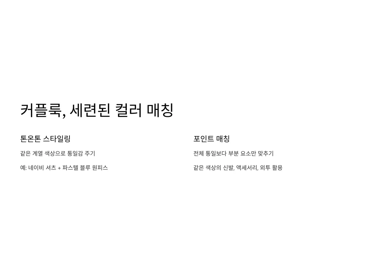 또한 전체를 동일한 컬러로 통일하기보다는, 포인트만 맞추는 것도 좋은 방법입니다. 예를 들어 같은 컬러의 신발, 액세서리 또는 외투 등으로 연출하면 자연스럽고 부담 없는 커플룩을 완성할 수 있습니다.