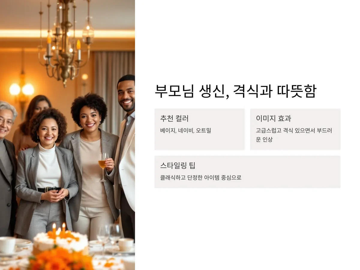 부모님 생신이나 어른과의 자리에서는 단정하면서도 따뜻한 인상을 주는 컬러 선택이 중요합니다. 대표적으로 베이지, 네이비, 오트밀 컬러는 고급스럽고 격식을 갖추면서도 부드러운 이미지를 전달합니다. 특히 톤다운된 파스텔 계열은 연령대 높은 분들에게 신뢰감을 줄 수 있습니다.