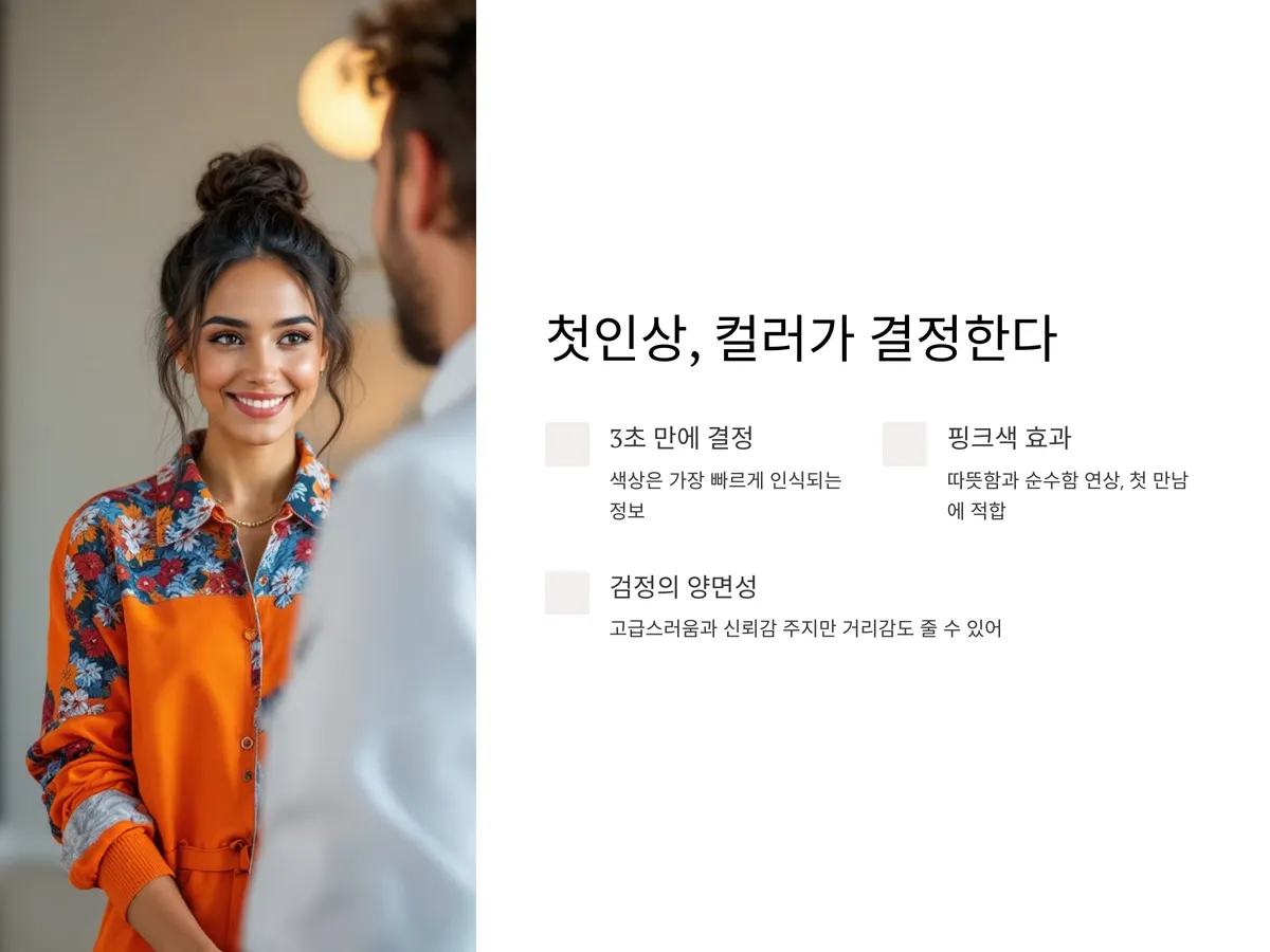 사람은 처음 만난 지 단 3초 만에 상대에 대한 인상을 결정한다고 합니다. 그중 ‘색상’은 그 어떤 요소보다도 빠르게 인식되는 정보입니다. 즉, 기념일 패션에서 어떤 색을 입느냐는 단순한 미적 요소를 넘어, 당신의 인상을 결정짓는 중요한 요인이라는 뜻입니다.