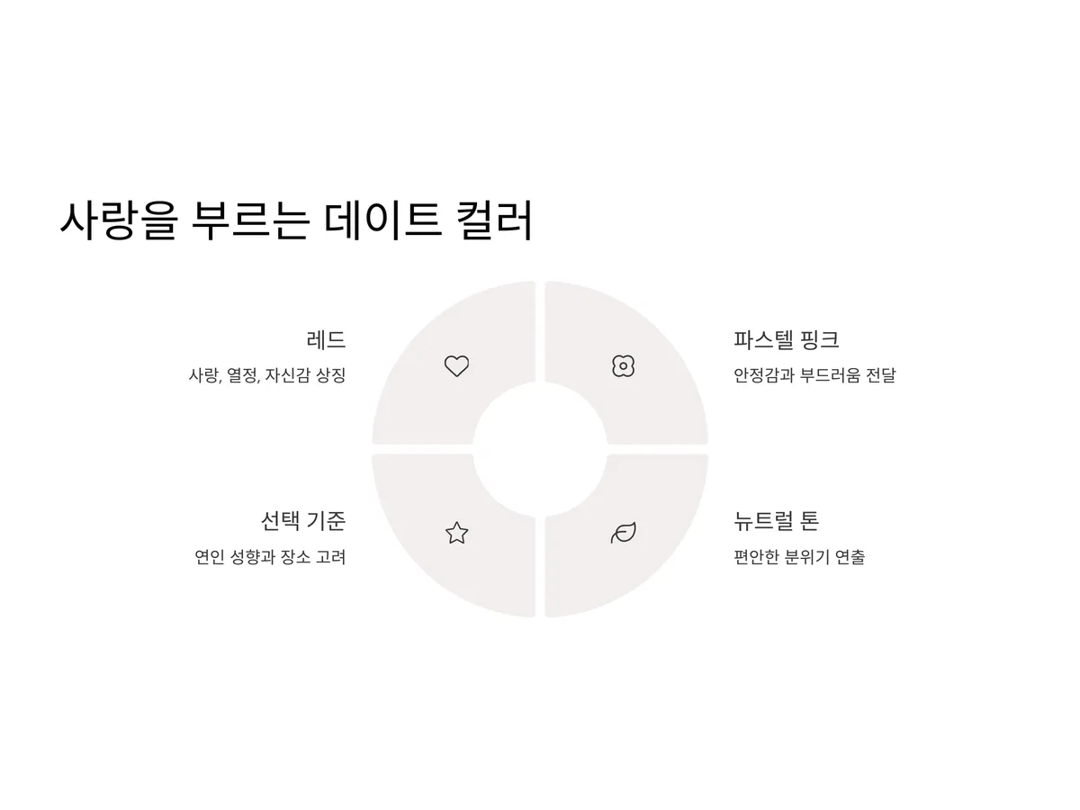 하지만 모든 상황에 레드가 적합한 것은 아닙니다. 안정감과 부드러움을 주고 싶다면 파스텔 핑크나 아이보리 계열도 훌륭한 대안입니다. 상대방과의 관계가 안정기에 접어들었다면, 서로 편안한 분위기를 연출할 수 있는 뉴트럴 톤도 추천됩니다. 연인의 스타일과 성향, 그리고 데이트 장소의 분위기를 고려해 컬러를 선택하는 것이 핵심입니다.